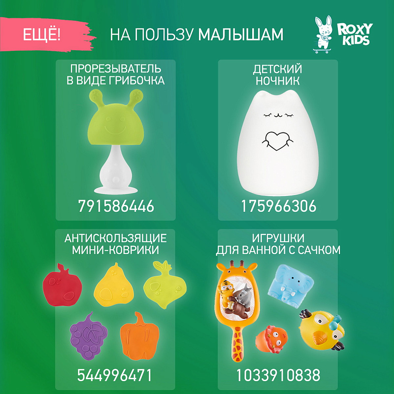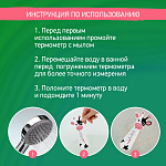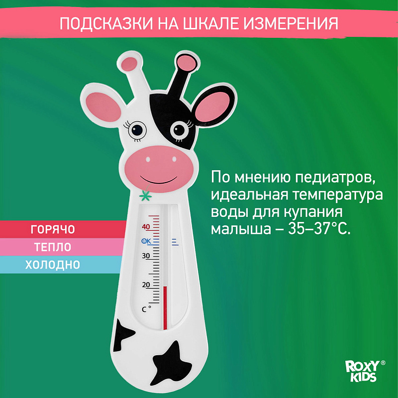 Этот термометр точно измеряет температуру воды для купания детей в ванной. Изделие плавает на поверхности и может оставаться в воде во время всего купания, так как не содержит ртути. Стеклянная шкала наполнена керосином и находится в пластиковом корпусе. Для измерения температуры воды нужно подержать термометр в ванной 1-2 минуты. Он имеет четкую шкалу до 50 градусов Цельсия. В ассортименте ROXY-KIDS есть несколько видов термометров.