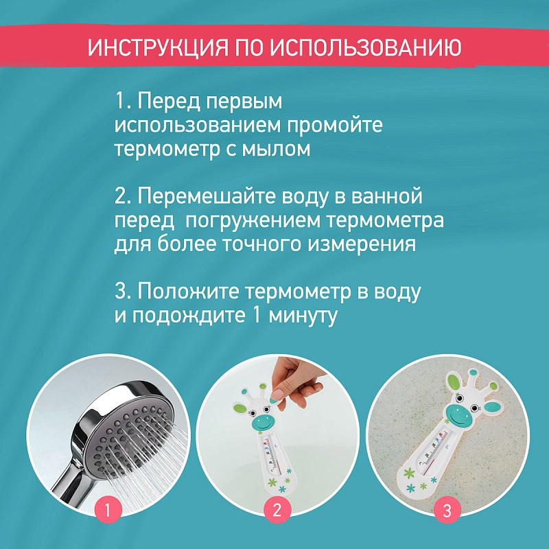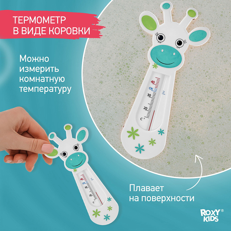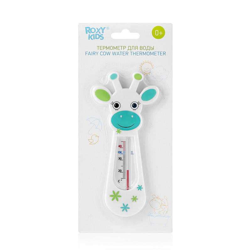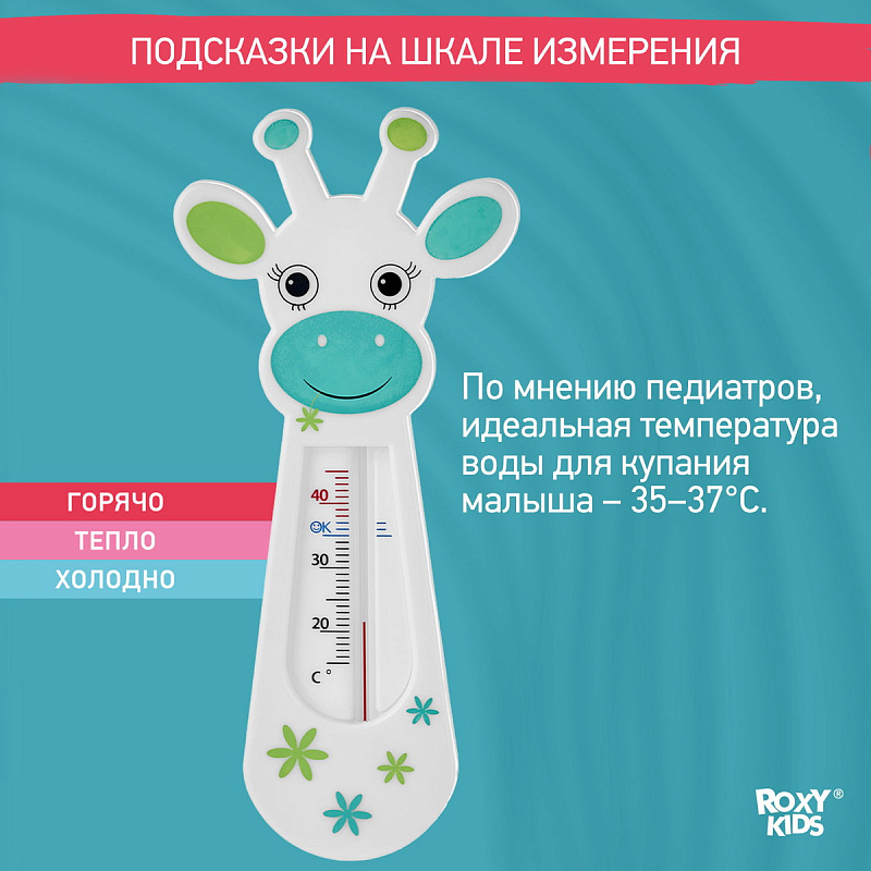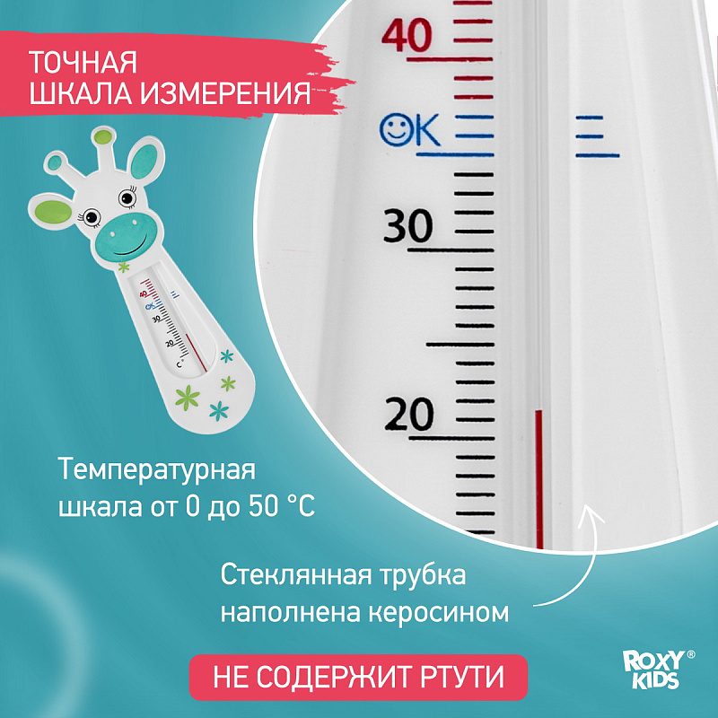 Этот термометр точно измеряет температуру воды для купания детей в ванной. Изделие плавает на поверхности и может оставаться в воде во время всего купания, так как не содержит ртути. Стеклянная шкала наполнена керосином и находится в пластиковом корпусе. Для измерения температуры воды нужно подержать термометр в ванной 1-2 минуты. Он имеет четкую шкалу до 50 градусов Цельсия. В ассортименте ROXY-KIDS есть несколько видов термометров.