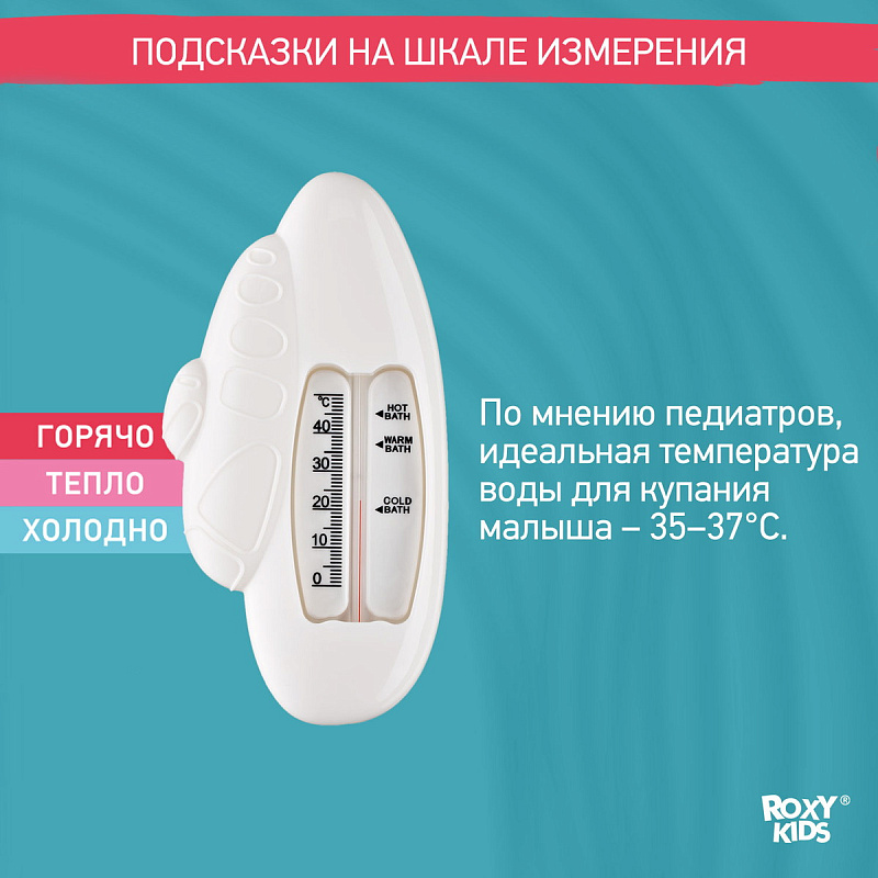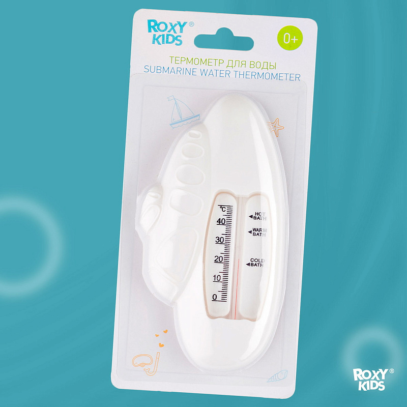 Этот термометр точно измеряет температуру воды для купания детей в ванной. Изделие плавает на поверхности и может оставаться в воде во время всего купания, так как не содержит ртути. Стеклянная шкала наполнена керосином и находится в пластиковом корпусе. Для измерения температуры воды нужно подержать термометр в ванной 1-2 минуты. Он имеет четкую шкалу до 50 градусов Цельсия. В ассортименте ROXY-KIDS есть несколько видов термометров.