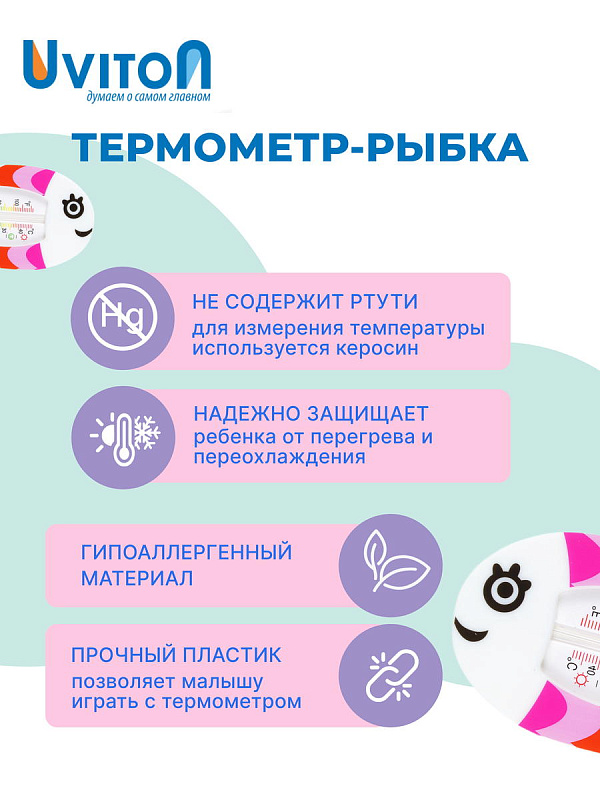 Термометр для воды Uviton Китенок двухсторонний 0053 – радость для малыша Красивый дизайн привлечет внимание карапуза, и водные процедуры станут веселыми и продуктивными. Термометр для воды Ювитон Китенок двухсторонний 0053 купить просто: необходимо оформить заявку на сайте «Все крохам». Преимущества: • Изделие точно измеряет температуру жидкости, а значит, малютка в безопасности. • Четкая шкала хорошо просматривается, что очень важно. • Главный плюс – нет ртути. • Непоседа сможет играть приспособлением, которое плавает на поверхности.