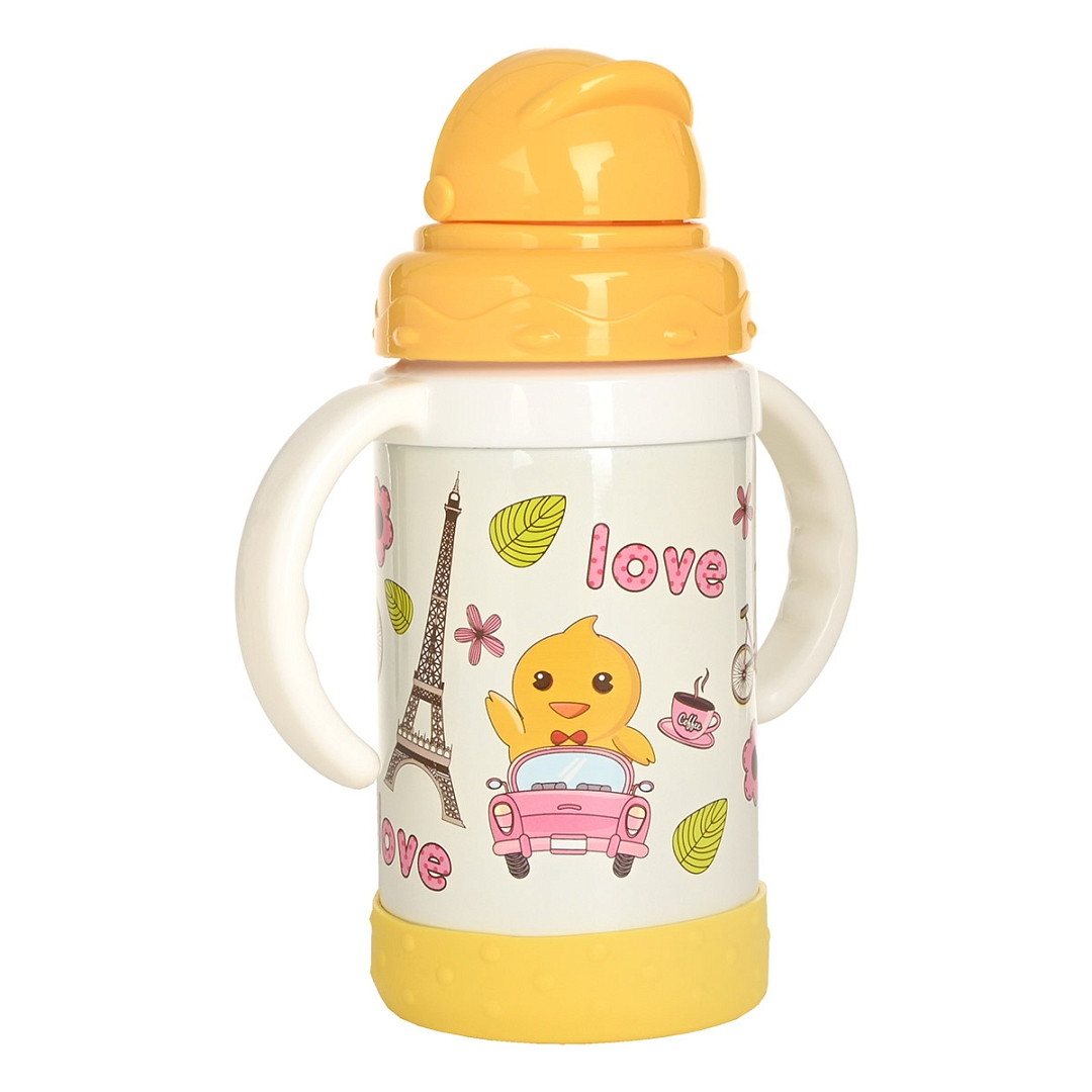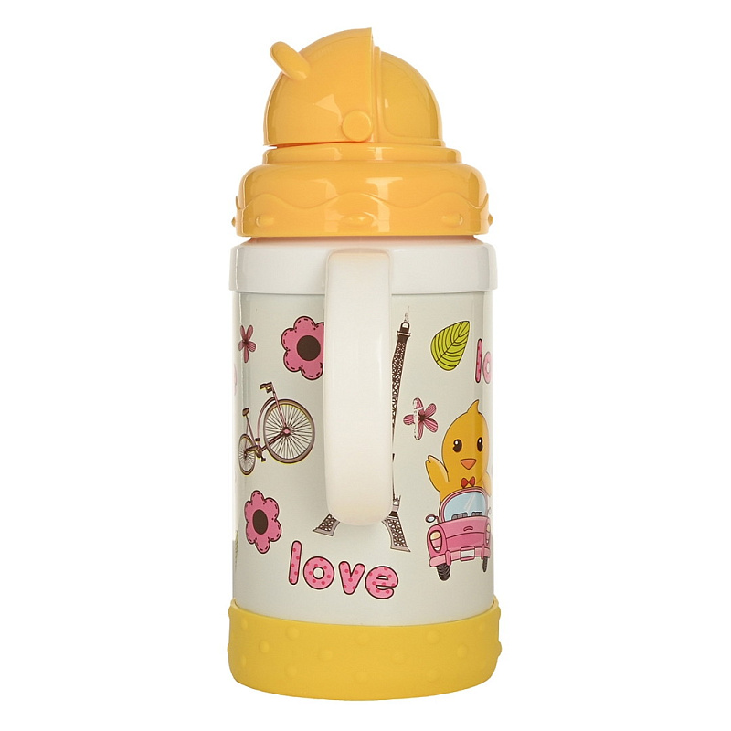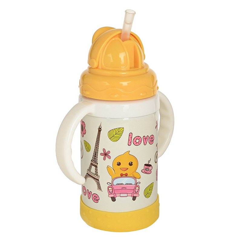 Детский термо-поильник 280 мл с силиконовой трубочкой. Корпус детской термокружки с ручкой изготовлен из высокопрочного пластика, колба из высококачественной пищевой нержавеющей стали.