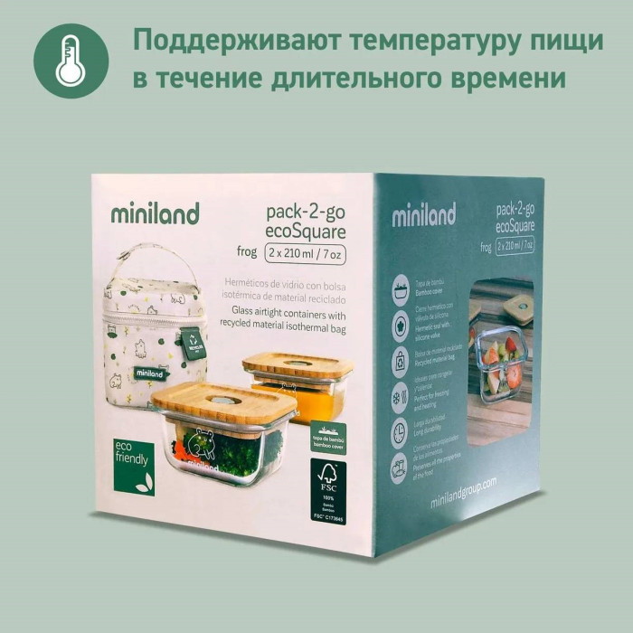 Термосумка Miniland Pack-2-Go Ecosquare с двумя стеклянными квадратными контейнерами по 210 мл птички