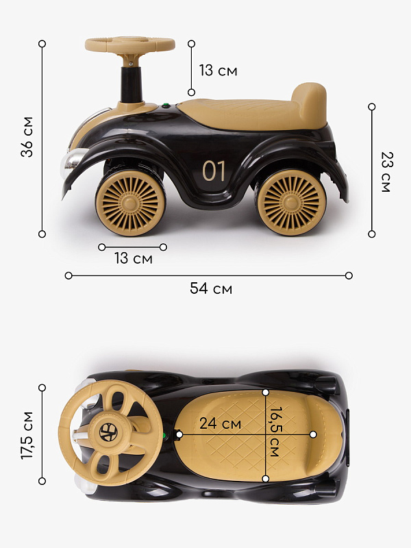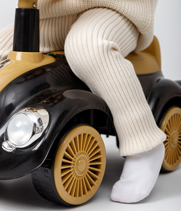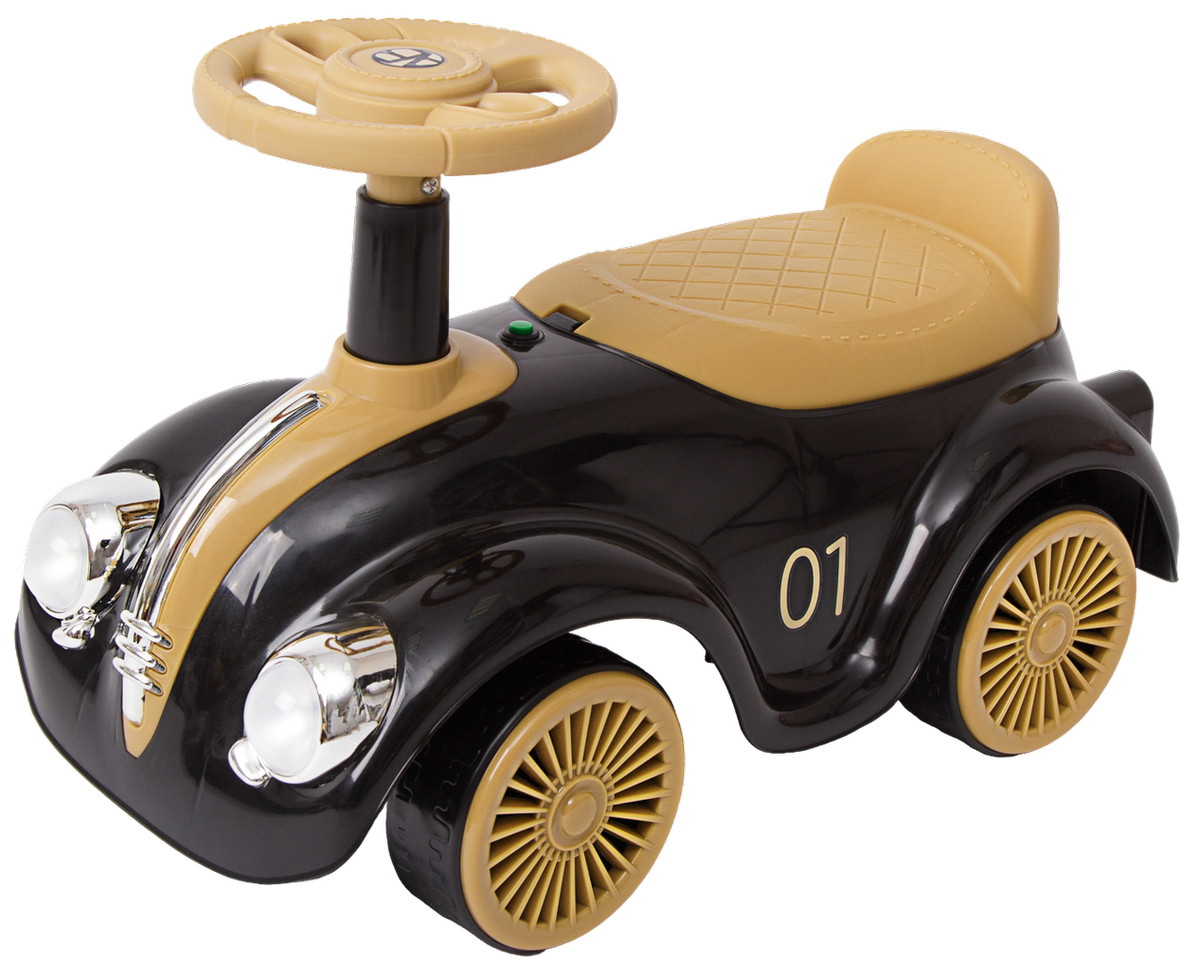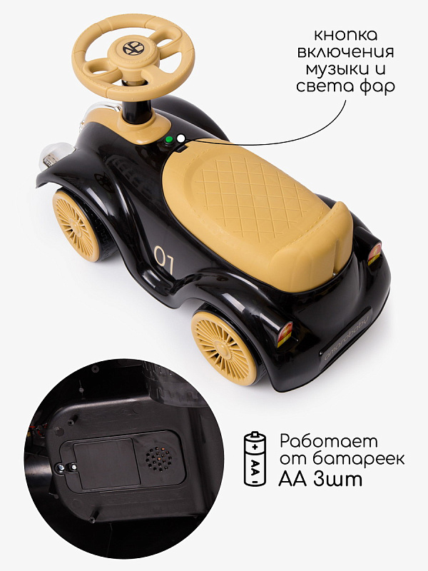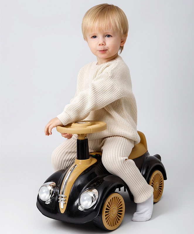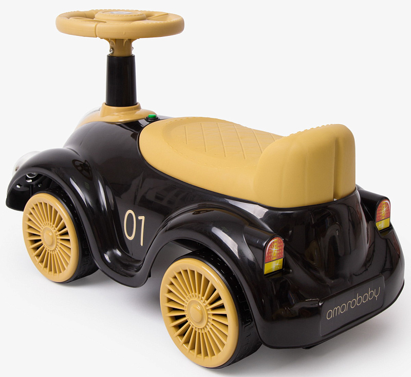Каталка-толокар Amarobaby Retro – стильное и яркое первое транспортное средство для вашего малыша. Данная модель пушкара универсальная, подойдет как для мальчиков, так и для девочек. Дизайн музыкальной каталки выполнен в стиле гоночного ретро автомобиля, это позволит вашему ребенку оставаться заметным, а 4 приятных встроенных мелодии дадут возможность получать большее удовольствие от катания. Цветные наклейки, стильный дизайн, светящиеся фары и имитация литых дисков сделают пушкар любимой игрушкой вашего малыша. Машинка весит всего – 2 кг, ее можно взять с собой на прогулку, а небольшие габариты (23см*26см*36см) облегчат транспортировку. Так же, за счет небольшого размера, пушкар можно будет использовать и дома. Широкие пластиковые колеса придают каталке дополнительную устойчивость и безопасность, а удобный руль позволит легко управлять ей, развивая координацию. Удобное эргономичное сиденье выполнено с учетом особенностей строения детского тела, а небольшая спинка на сидении создать дополнительный комфорт для малыша и уменьшит нагрузку на спину. Каталка детская изготовлена из качественной пластмассы, не содержащей вредных веществ, полностью безопасна для детей и имеет необходимый сертификат