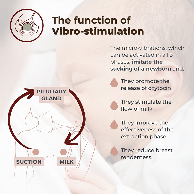 Режим вибрации может быть активирован на всех фазах для дополнительной стимуляции молочных протоков, способствуя более быстрому и естественному выделению молока.