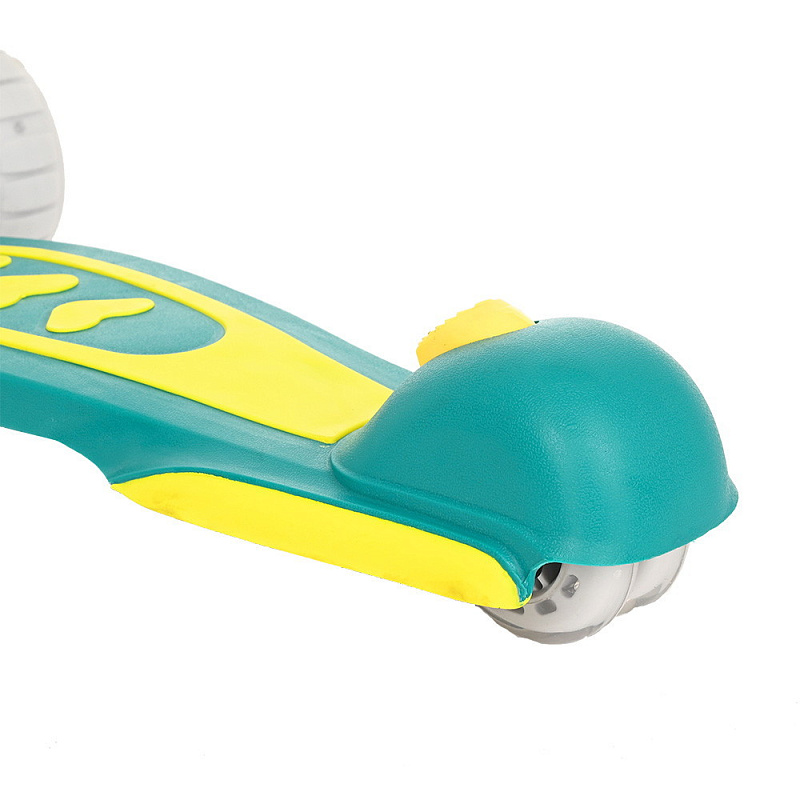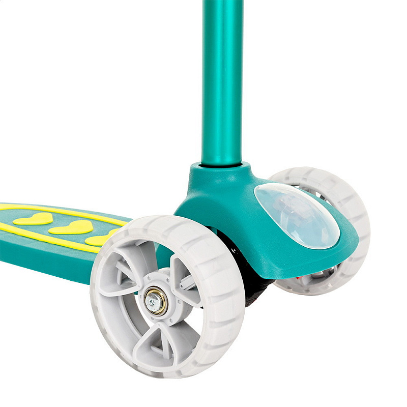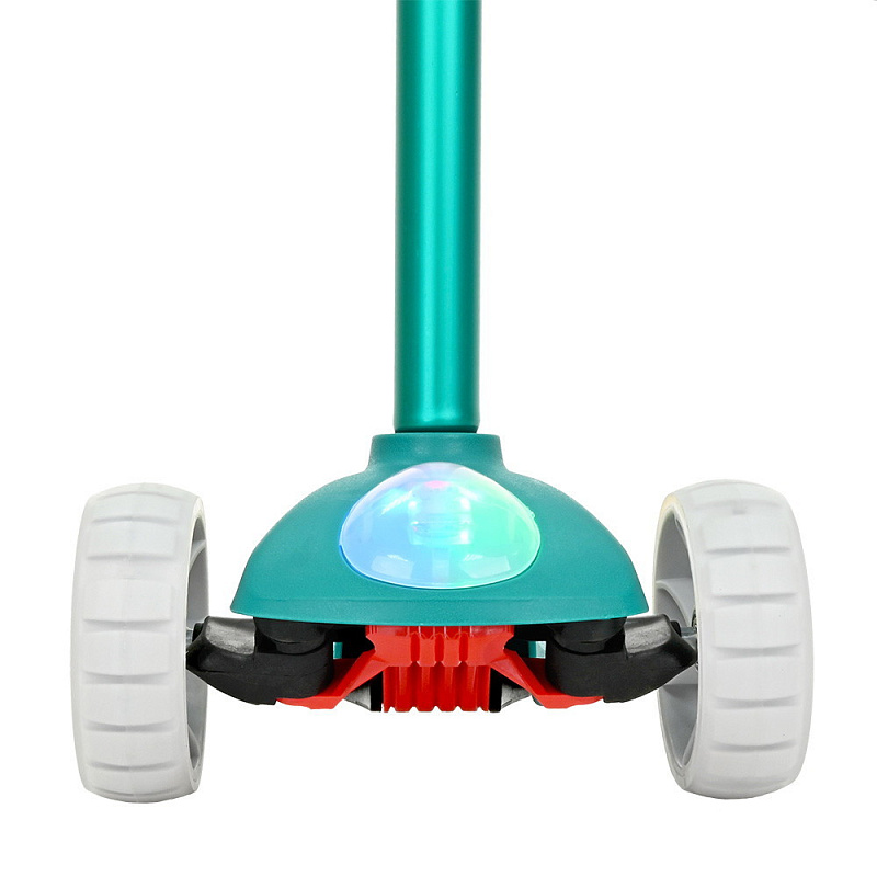 Трёхколёсный самокат оснащён подсветкой на колёсах. Передняя панель также дополнена световыми эффектами, которые работают от тряски при езде. Модель выполнена из качественных материалов.