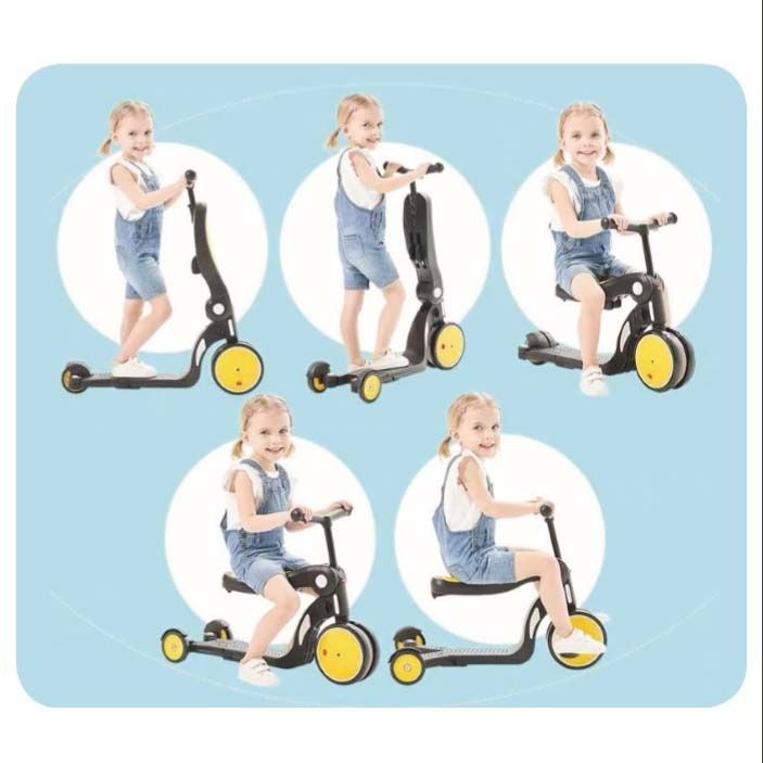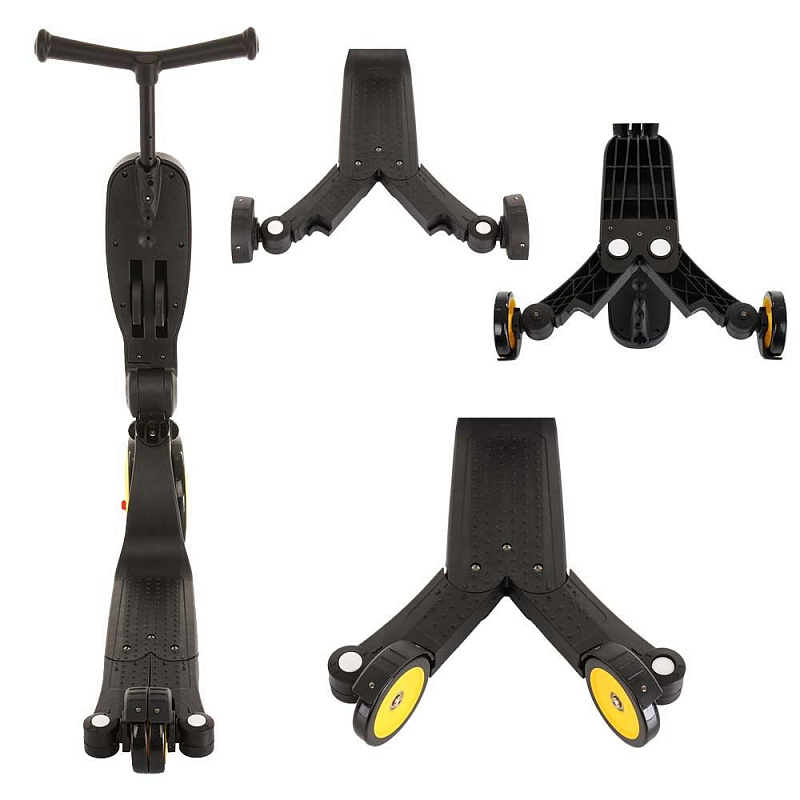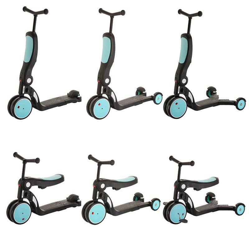 Детский самокат изготовлен из качественных материалов. Сочетает в себе функции беговела и велосипеда с функцией трансформации из трехколесных в двухколесные. Педали съемные, хранятся в пазах сидения.
