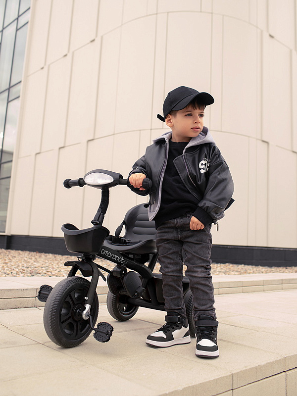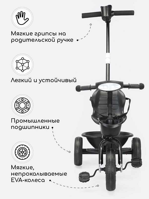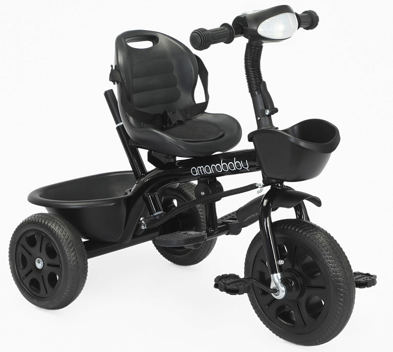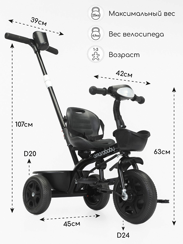 Велосипед трехколесный детский AmaroBaby Legend - легкий и устойчивый трехколесный велосипед для первых поездок малыша, предназначен для детей от 1 года и выдерживает нагрузку до 25 кг. Он не только доставит удовольствие от катания, но и научит ребенка держать равновесие и тренировать координацию. Велосипед подходит как для девочек, так и для мальчиков. Багажник и передняя корзина входят в комплект детского велосипеда, поэтому ребенок и родители могут взять с собой на прогулку игрушки и другие аксессуары. Трехколесный велосипед с ручкой - безопасный, комфортный, красивый и многофункциональный детский транспорт как для малышей, так и для родителей. Велосипед для прогулок имеет эргономичное сиденье с ремнем безопасности, и регулировкой ближе или дальше от руля. Удобные складные подножки велосипеда, не мешают движению, когда малыш крутит педали. У велосипеда нескользящие ручки с ограничителями для удобства и безопасности ребенка. Детский велосипед оснащен музыкой и световой панелью, что сделает прогулку вашего малыша более интересной и веселой. Велосипед для детей весит всего 4,9 кг и легко управляется взрослым с помощью комфортной ручки с подстаканником, которую можно регулировать по высоте. Легкие бесшумные колеса из материала EVA не прокалываются и не требуют подкачки, легко очищаются от загрязнений. Диаметр переднего колеса 24 см, задних колес 20 см. Велосипед для мальчика и девочки разработан для детей дошкольного возраста и легко может служить альтернативой прогулочной коляски.