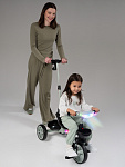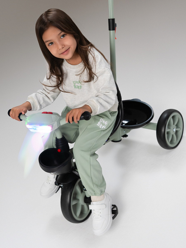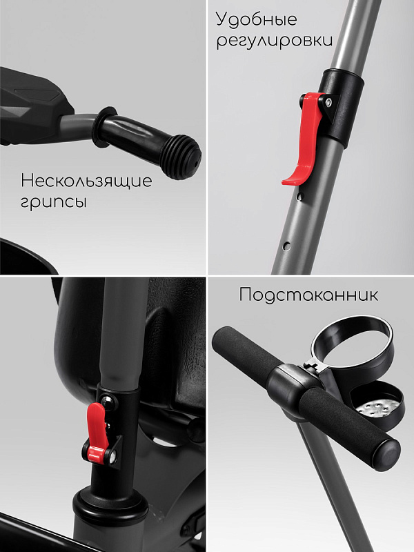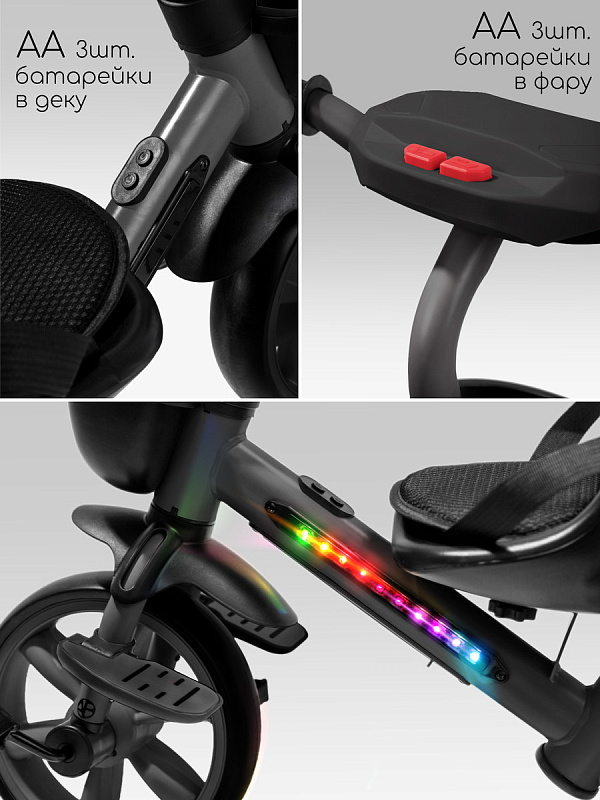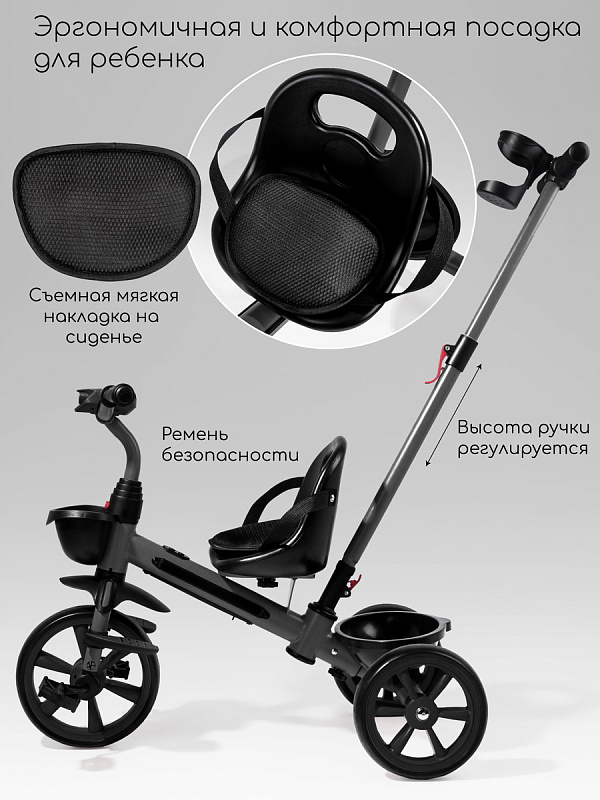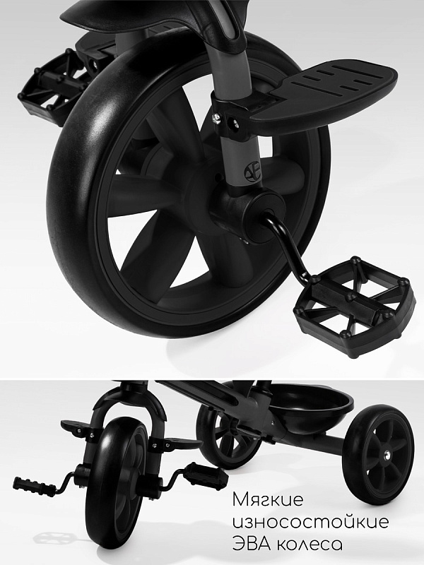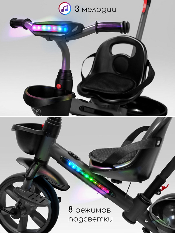 Всеми функциями – переключением музыки и режимов подсветки – малыш сможет легко управлять сам благодаря удобному расположению кнопок. Родители оценят удобную родительскую ручку, которая не только позволяет полностью контролировать движение велосипеда, но и регулируется по высоте, подстраиваясь под рост взрослого. Для максимального комфорта малыша предусмотрены специальные подножки, где он сможет удобно расположить ножки во время поездки. Большие, проходимые колеса из прочного EVA-материала не боятся проколов и обеспечивают плавное движение по различным поверхностям, а эргономичное сиденье гарантирует комфортную посадку даже во время долгих прогулок.