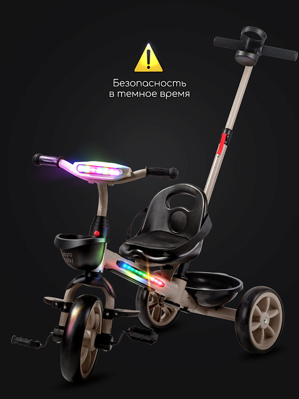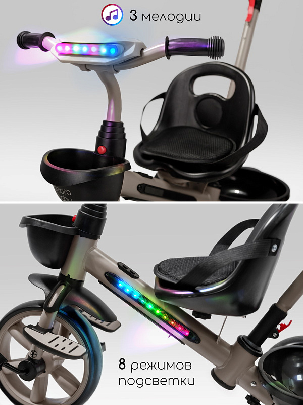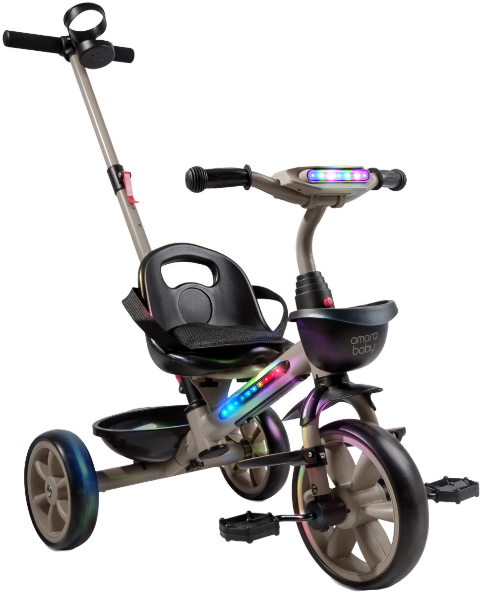 Велосипед трехколесный детский AmaroBaby Scout- идеальный компаньон для вашего маленького исследователя, который только начинает открывать мир. Разработанный для детей от 1 года и рассчитанный на вес до 25 кг, велосипед детский сочетает в себе безопасность, комфорт и развлечения, делая каждую прогулку незабываемой. Но настоящие чудеса начинаются с динамичной LED-подсветкой рамы и руля, которая создает эффектное свечение, и встроенной музыкой, которая сделает каждую поездку веселее.