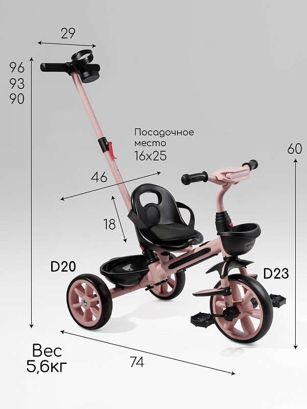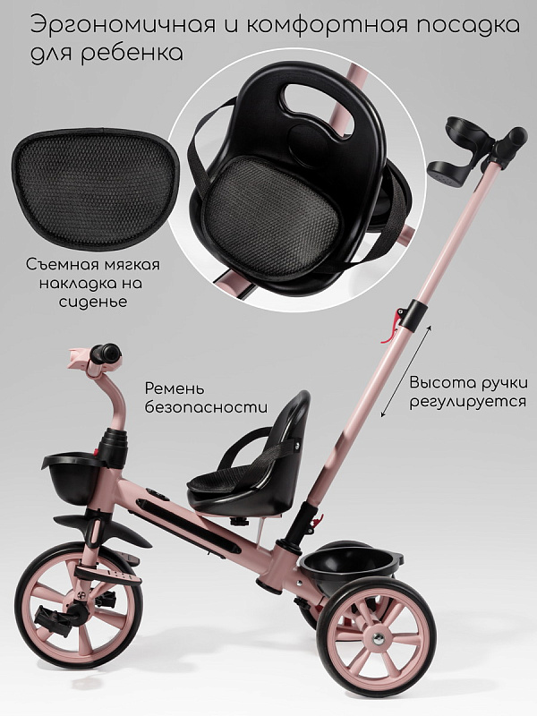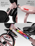 Всеми функциями – переключением музыки и режимов подсветки – малыш сможет легко управлять сам благодаря удобному расположению кнопок. Родители оценят удобную родительскую ручку, которая не только позволяет полностью контролировать движение велосипеда, но и регулируется по высоте, подстраиваясь под рост взрослого. Для максимального комфорта малыша предусмотрены специальные подножки, где он сможет удобно расположить ножки во время поездки. Большие, проходимые колеса из прочного EVA-материала не боятся проколов и обеспечивают плавное движение по различным поверхностям, а эргономичное сиденье гарантирует комфортную посадку даже во время долгих прогулок.