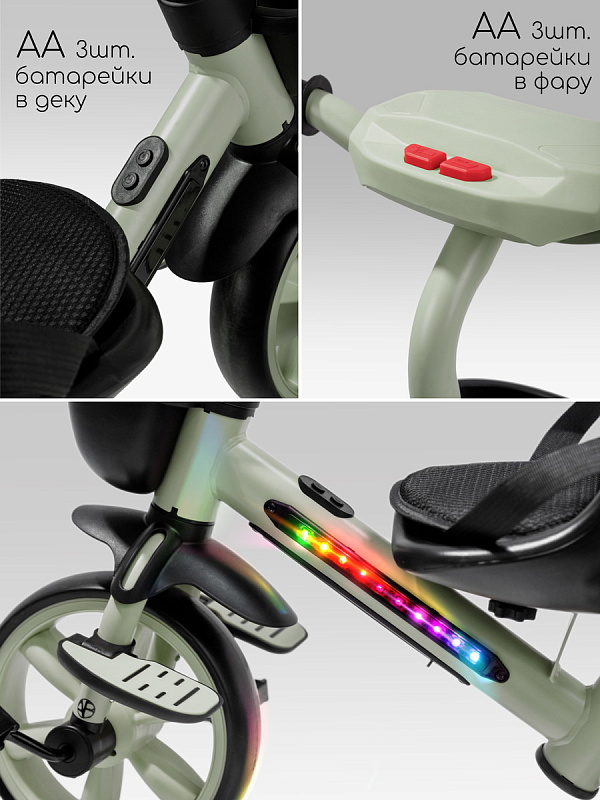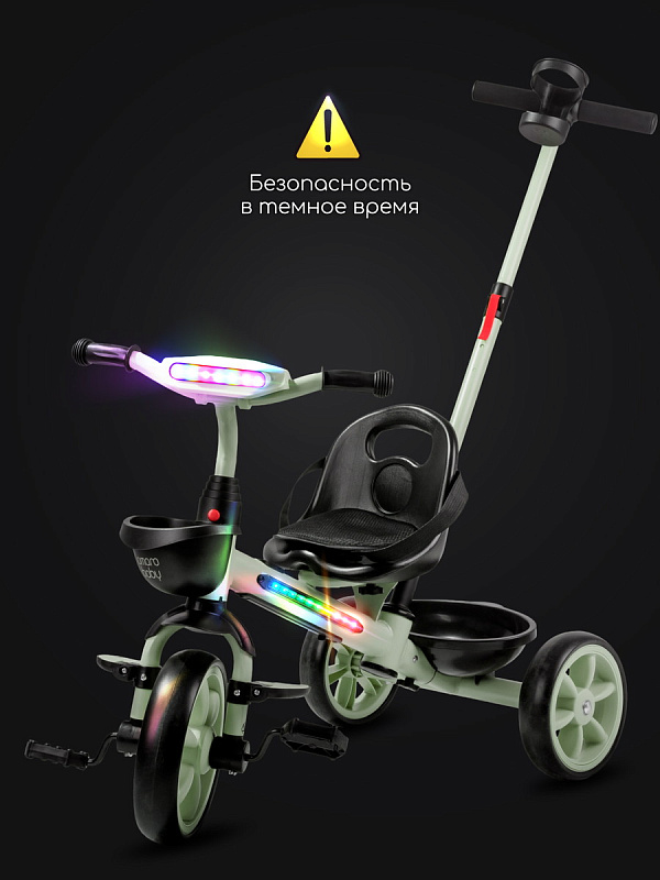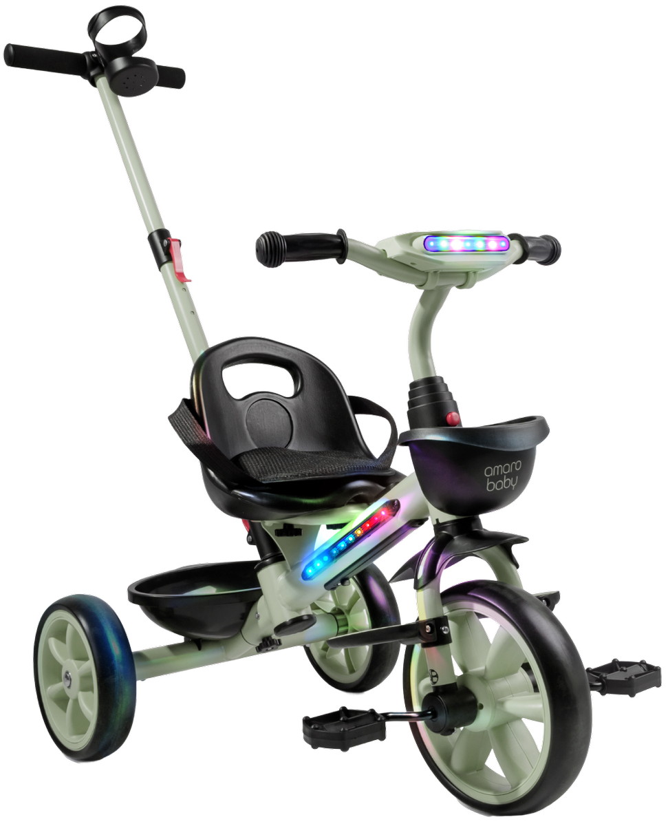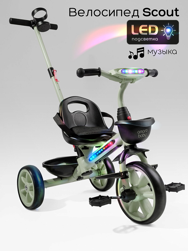 Велосипед трехколесный детский AmaroBaby Scout- идеальный компаньон для вашего маленького исследователя, который только начинает открывать мир. Разработанный для детей от 1 года и рассчитанный на вес до 25 кг, велосипед детский сочетает в себе безопасность, комфорт и развлечения, делая каждую прогулку незабываемой. Но настоящие чудеса начинаются с динамичной LED-подсветкой рамы и руля, которая создает эффектное свечение, и встроенной музыкой, которая сделает каждую поездку веселее.