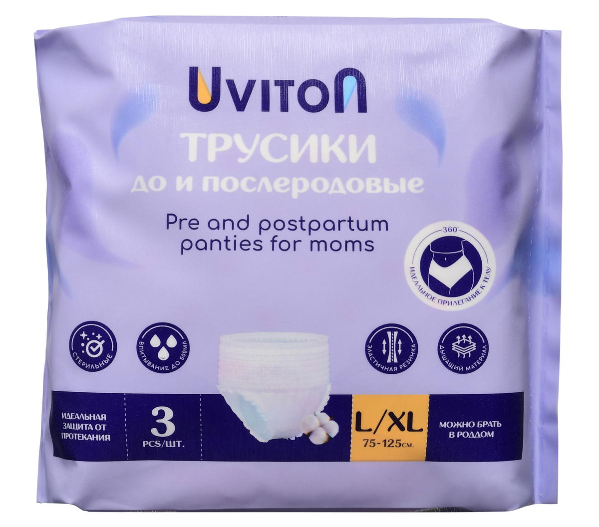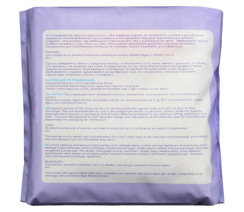 Гигиенические трусики серии Uviton – это надежная защита от протеканий и запаха в дни обильных выделений. Рекомендованы для использования в послеродовой период (в перинатальных центрах, роддомах, стационарах, где необходима стерильность), так и в домашних условиях. Эффективная защита в любом положении: сидя, стоя или лежа. Отличаются прекрасным дизайном и высоким качеством применяемых для изготовления материалов. Упаковку просим сохранять, для информации.