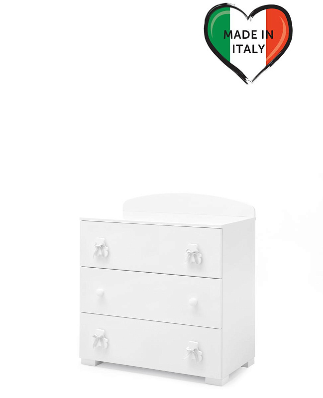 Итальянская компания Erbesi представляет комод Bubu – вместительную тумбу с тремя выдвижными ящиками. Изготовлен комод из ДСП, соответствующего европейскому стандарту Е1 (низкое содержание формальдегида), и покрыт износостойким ПВХ материалом для защиты и привлекательного внешнего вида. Для дополнительной прочности и устойчивости задние стенки выполнены из того же ДСП, но большей толщины. Ручки комода – из натурального бука, что придает ему элегантности. Габариты тумбы составляют 91 см в длину, 55 см в ширину и 98,5 см в высоту. Вес изделия – 52 кг. В целом, комод Bubu – это прочная, надежная и стильная тумба, идеально подходящая для детской комнаты или спальни. Поставляется на склад с белыми лентами. Также можно заказать ленты серую,розовую,голубую.Три выдвижных ящика. на металлических направляющих.