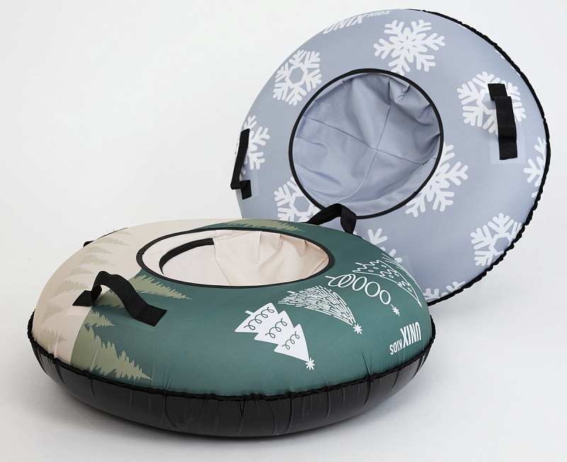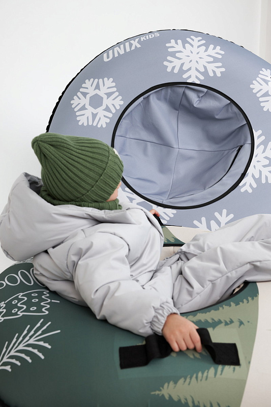 Уникальный принт UNIX Kids, представленный в двух вариантах — Snow Grey и Tree Green, добавит радости и веселья в развлечения на улице. Круг для катания на снегу выполнен из прочной водоотталкивающей ткани Oxford, которая не только защищает от влаги, но и легко чистится от загрязнений. Низ ватрушки изготовлен из армированного ПВХ, что обеспечивает идеальное скольжение по снегу и льду.