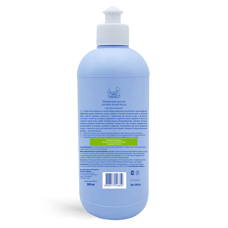 Универсальное средство для мытья детской посуды серии "Наша мама" с особой мягкой формулой на основе моющих компонентов растительного происхождения и ионов серебра эффективно удаляет различные сложные, жировые и засохшие загрязнения даже в холодной воде. Средство прекрасно справляется с характерными для детской посуды и бутылочек остатками от молочных, углеводных, крахмалистых и фруктово-ягодных продуктов. Полностью смывается водой. Ионы серебра обладают мощным обеззараживающими свойствами. Экстракт ромашки оказывает антисептическое действие. Экстракт алоэ-вера, обладает выраженными увлажняющими свойствами и ухаживает за кожей рук. Средство рекомендовано для мытья различной посуды, а также аксессуаров для кормления и сосок малышей с рождения 0+. У средства концентрированная формула, а значит экономный расход.