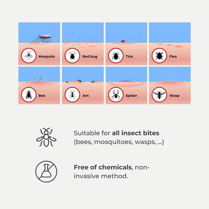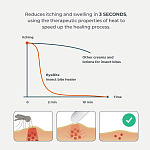 - Локализованное тепло проникает под поверхность кожи и активно нейтрализует белки слюны и яда насекомых, вызывающие воспаление. Как только раздражители рассасываются, иммунная реакция организма прекращается, что обеспечивает быстрое облегчение боли, отека и зуда.