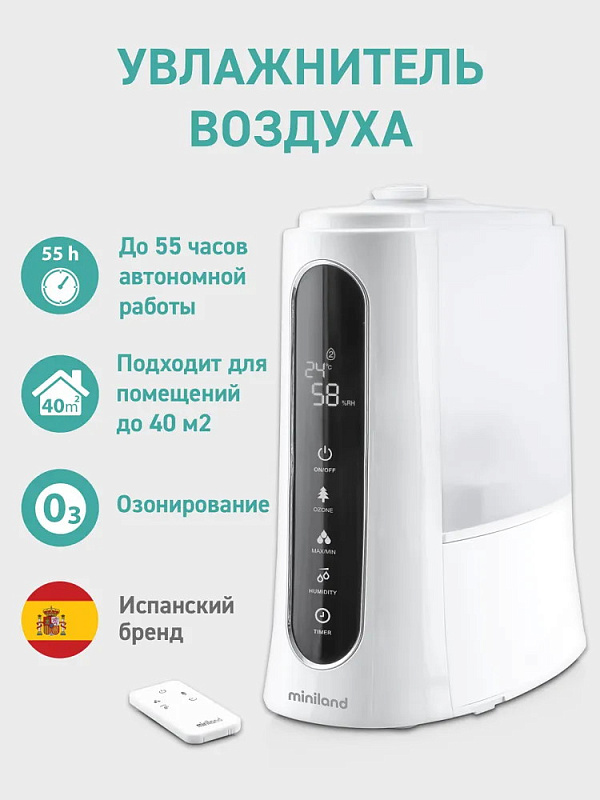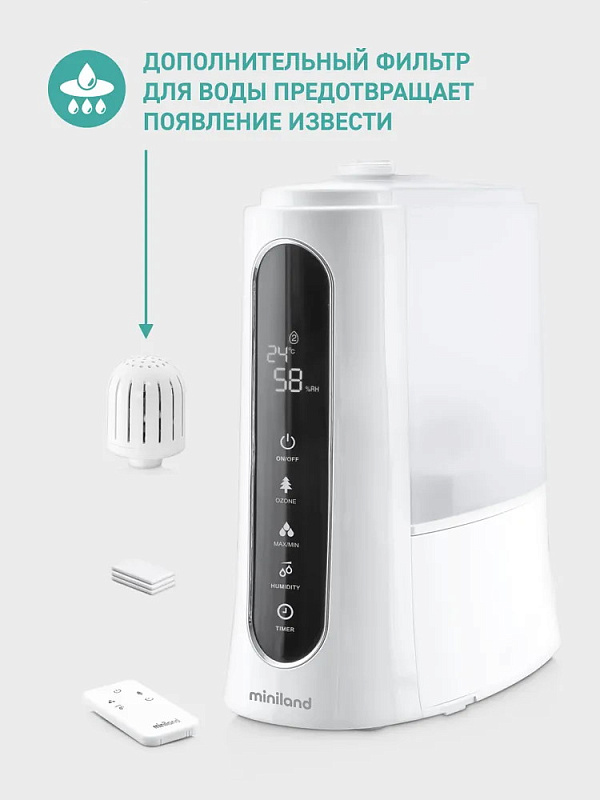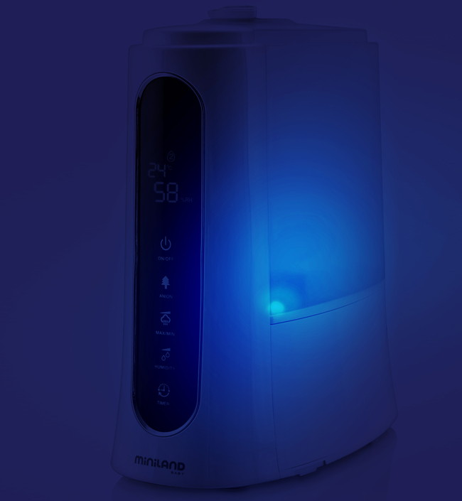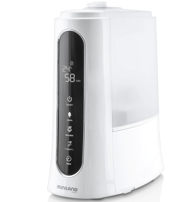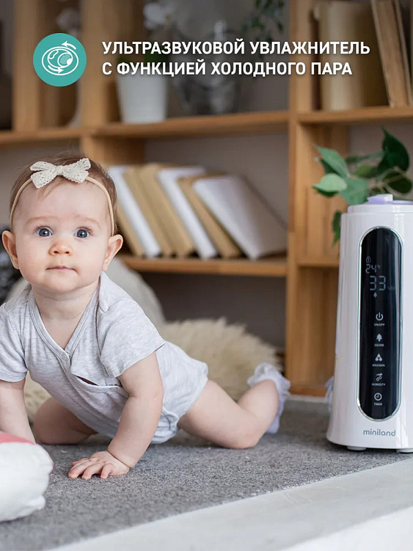 Miniland Humitouch pure – ультразвуковой увлажнитель-озонатор воздуха с функциями холодного пара, аромадиффузора, подсветкой и пультом управления. Дополнительно показывает уровень влажности и температуру в комнате. Humitouch pure сделает воздух в комнате чистым и увлажненным, который будет содержать больше молекул кислорода, необходимых для нормальной жизнедеятельности ребенка и членов его семьи.