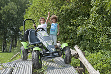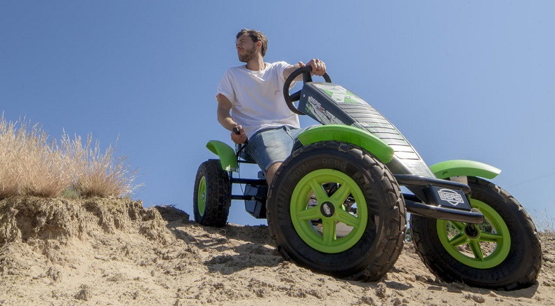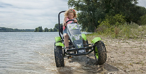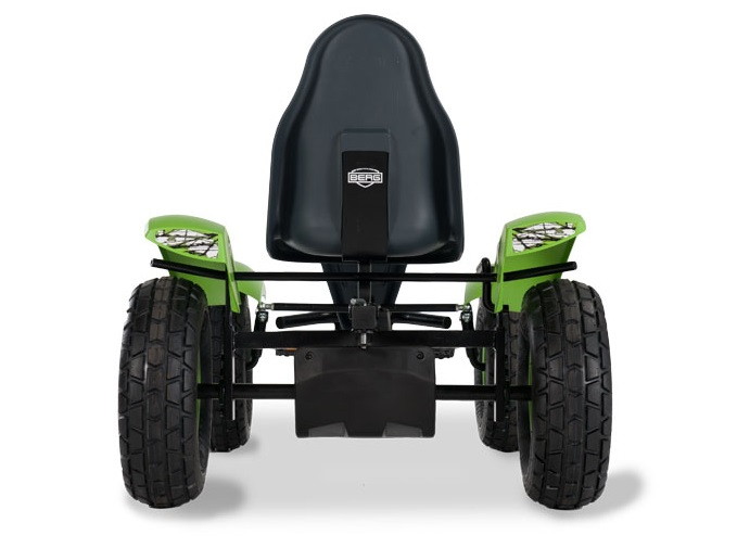 У веломобиля регулируется сиденье, благодаря чему можно выбрать положение наиболее подходящее именно вам, не важно ребенок вы или уже взрослый. Четырехколесная база не дает утратить сцепление с дорогой, а передняя независимая подвеска повышает проходимость на неровной дороге. Яркой отличительной особенностью веломобилей серии Off-road являются большие колеса, с внедорожным протектором шин.