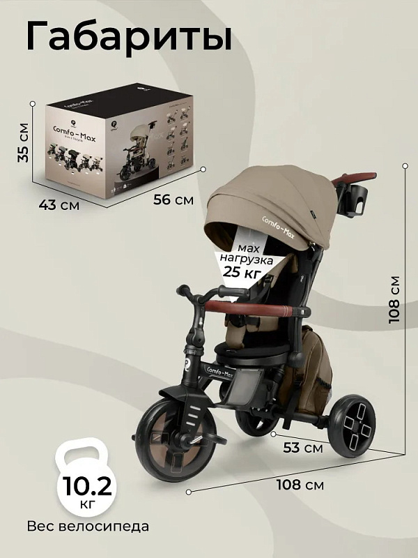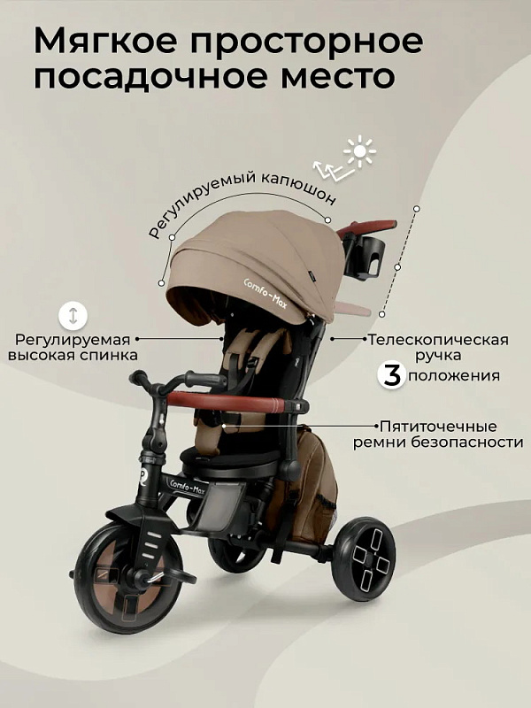 Трехколесный велосипед Qplay Comfo Max — детский велосипед - коляска для ребенка от 10 месяцев до 6 лет. 8 вариаций трансформаций позволит адаптировать велосипед под потребности возраст вашего малыша. Этот детский транспорт идеально подходит для прогулок по городу и паркам, сочетая в себе функциональность, безопасность и комфорт для детей.