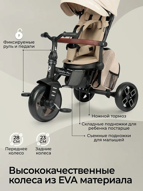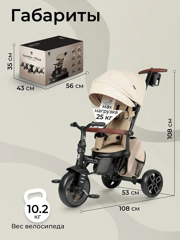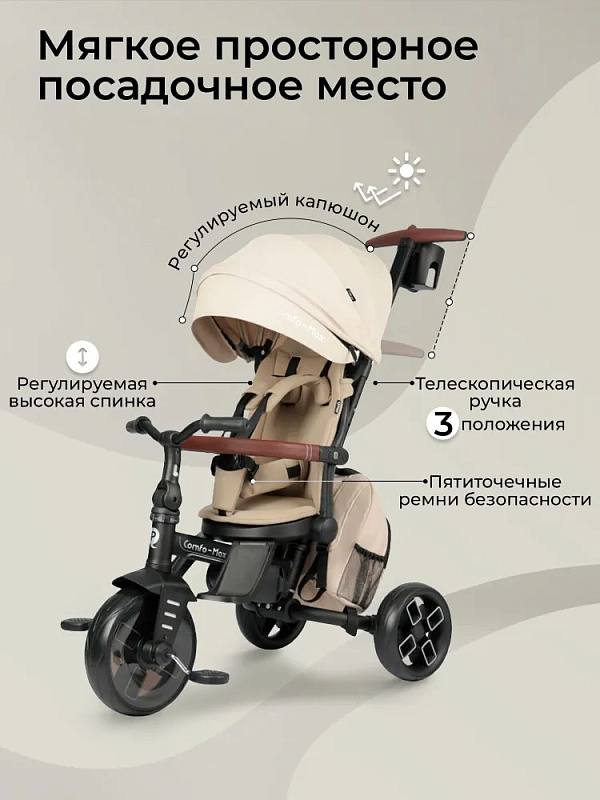 Трехколесный велосипед Qplay Comfo Max — детский велосипед - коляска для ребенка от 10 месяцев до 6 лет. 8 вариаций трансформаций позволит адаптировать велосипед под потребности возраст вашего малыша. Этот детский транспорт идеально подходит для прогулок по городу и паркам, сочетая в себе функциональность, безопасность и комфорт для детей.