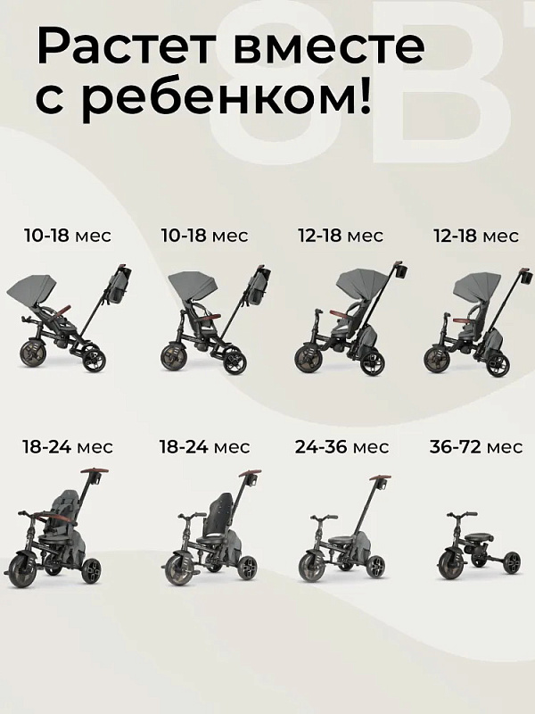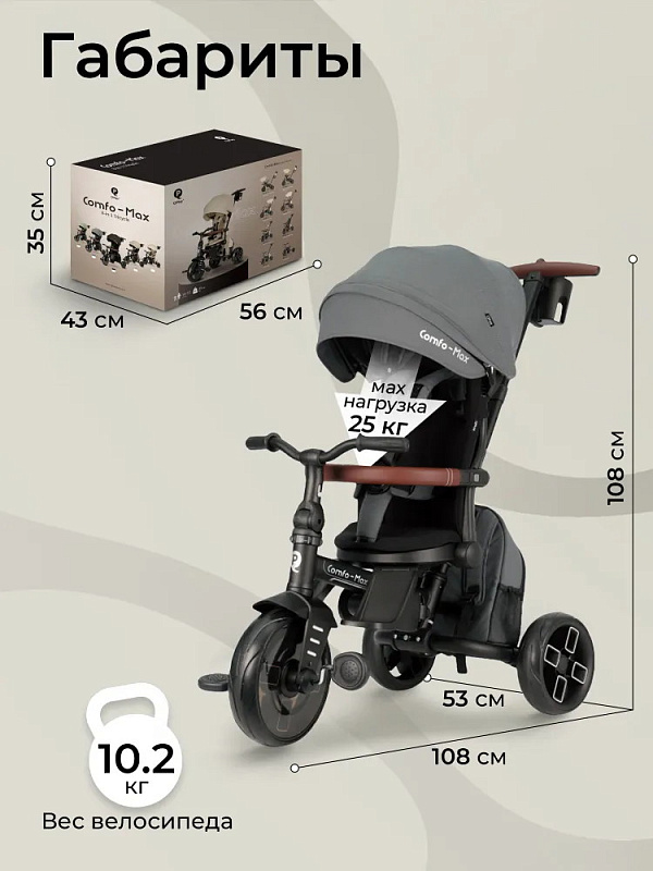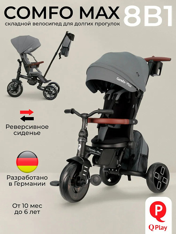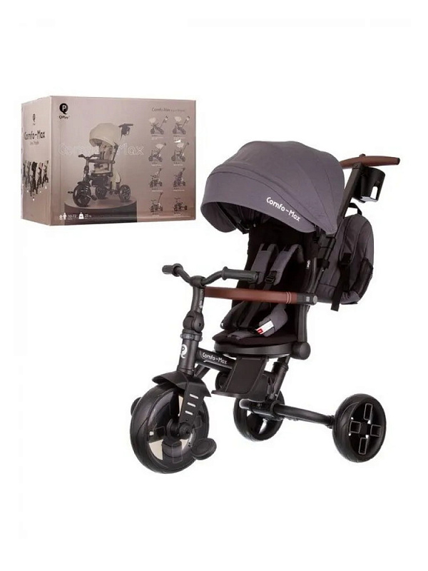 Трехколесный велосипед Qplay Comfo Max — детский велосипед - коляска для ребенка от 10 месяцев до 6 лет. 8 вариаций трансформаций позволит адаптировать велосипед под потребности возраст вашего малыша. Этот детский транспорт идеально подходит для прогулок по городу и паркам, сочетая в себе функциональность, безопасность и комфорт для детей.
