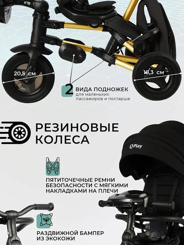 - Надежные пятиточечные ремни с мягкими накладками и раздвижной бампер из экокожи обеспечат безопасность вашего малыша во время катания;