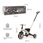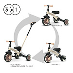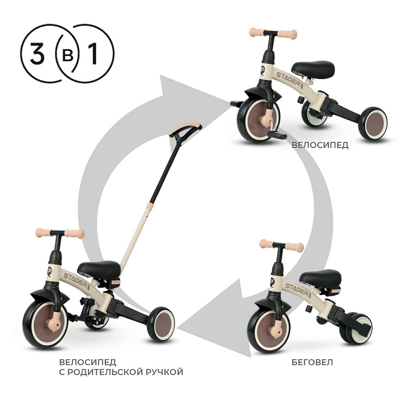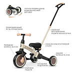 - 3 режима использования: беговел, трехколесный велосипед с педалями, детский трехколесный велосипед с родительской ручкой;