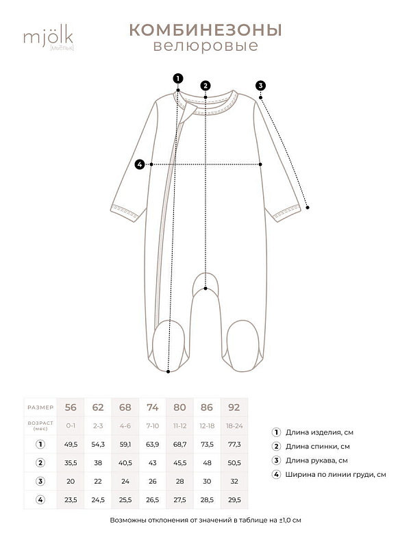 Велюровый комбинезон Mjolk — это детский комбинезон на молнии с закрытой ножкой во всех размерах с 56 по 92, выполненный из тёплого хлопчатобумажного велюра с небольшой добавкой синтетической ткани, которая делает его более прочным. Он станет отличным комбинезоном для прохладной погоды. Можно носить как первый или второй слой, использовать в качестве пижамы или поддевы.