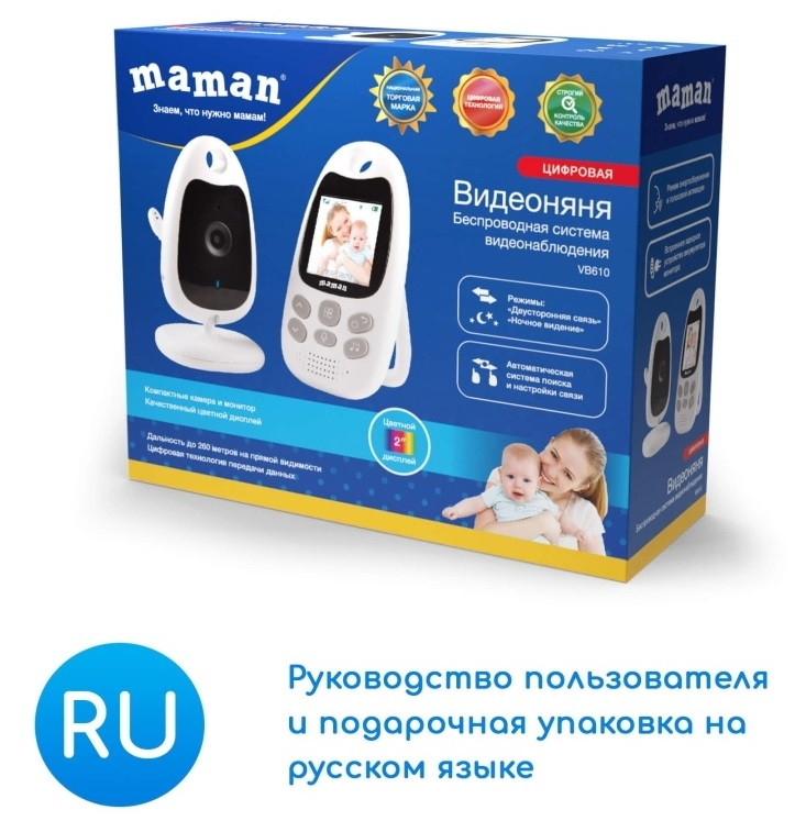 Беспроводная видеоняня Maman VB610 с компактной камерой и монитором – новейшая модель российского бренда Maman. Компактный дизайн и качественный цветной экран – отличия устройства от конкурентов. У монитора предусмотрена подставка, которая позволяет расположить блок рядом, пока мама читает книгу или занимается домашними делами.