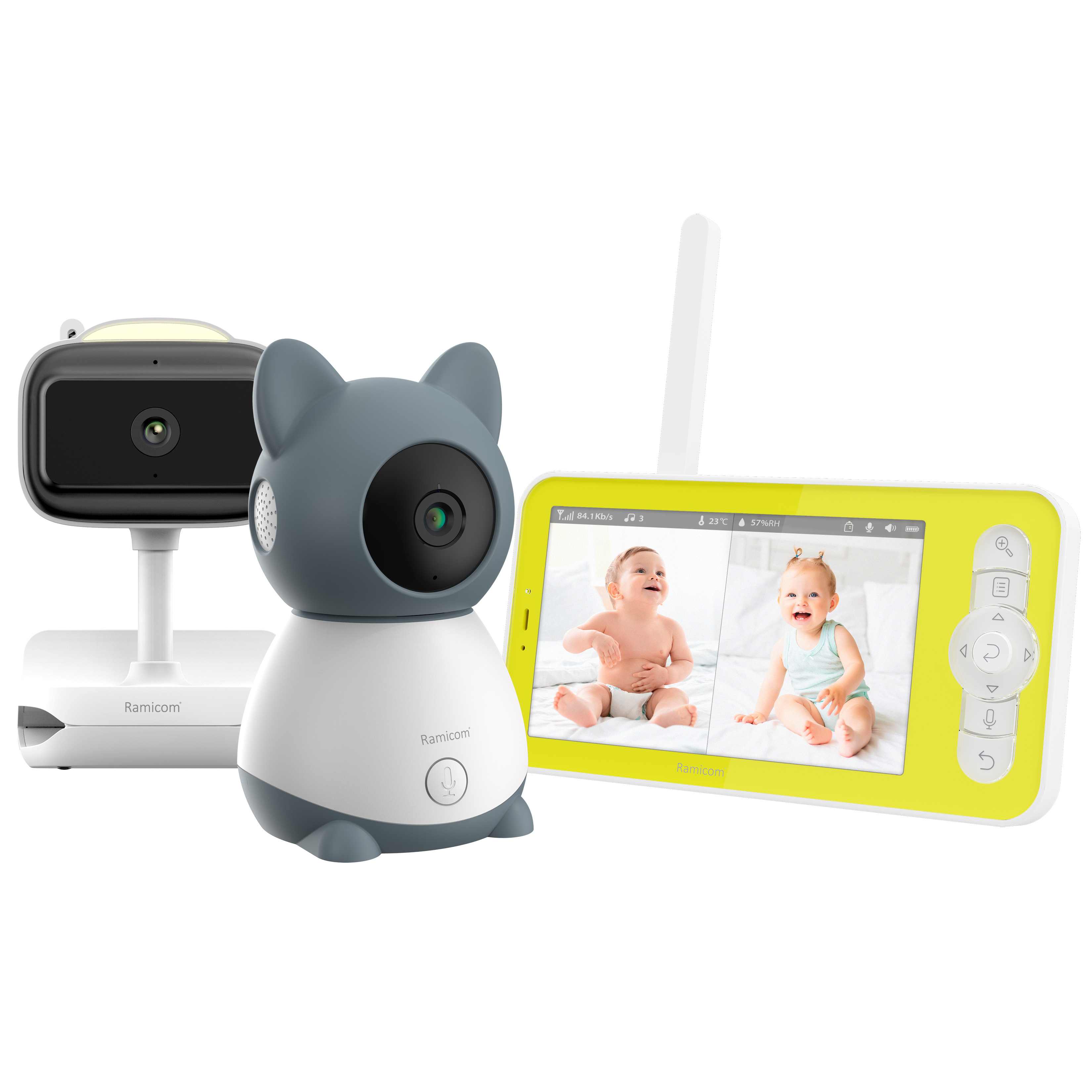 В комплект этой видеоняни включены две разные камеры, чтобы вы могли наблюдать за двумя детьми одновременно, вести мониторинг с разных ракурсов или контролировать обстановку в разных комнатах. Одна камера с поворотным механизмом с удаленным управлением. Вторая камера с креплением-прищепкой на гибкой ножке, многоцветным ночником и встроенным аккумулятором. Можно одновременно видеть обе камеры на разделенном экране или просматривать каждую из них поочередно. Цифровая видеоняня Ramicom VRC300400C с большим экраном, диагональ которого составляет 12,7 см (пять дюймов). В видеоняне собраны все важные функции, включая датчик движения и возможность подключения к смартфону или планшету для мониторинга из любой точки мира. Видеоняня непрерывно контролирует вашего малыша днём и ночью в режиме 24/7. Может работать в режиме экономии энергии и включаться при обнаружении звука (VOX) или движения вокруг камеры. При этих же событиях поступает пуш-уведомление на смартфоне, если вы подключили видеоняню к домашней сети Wi-Fi. С помощью функции обратной связи вы можете попытаться успокоить малыша на расстоянии, если он расплачется.