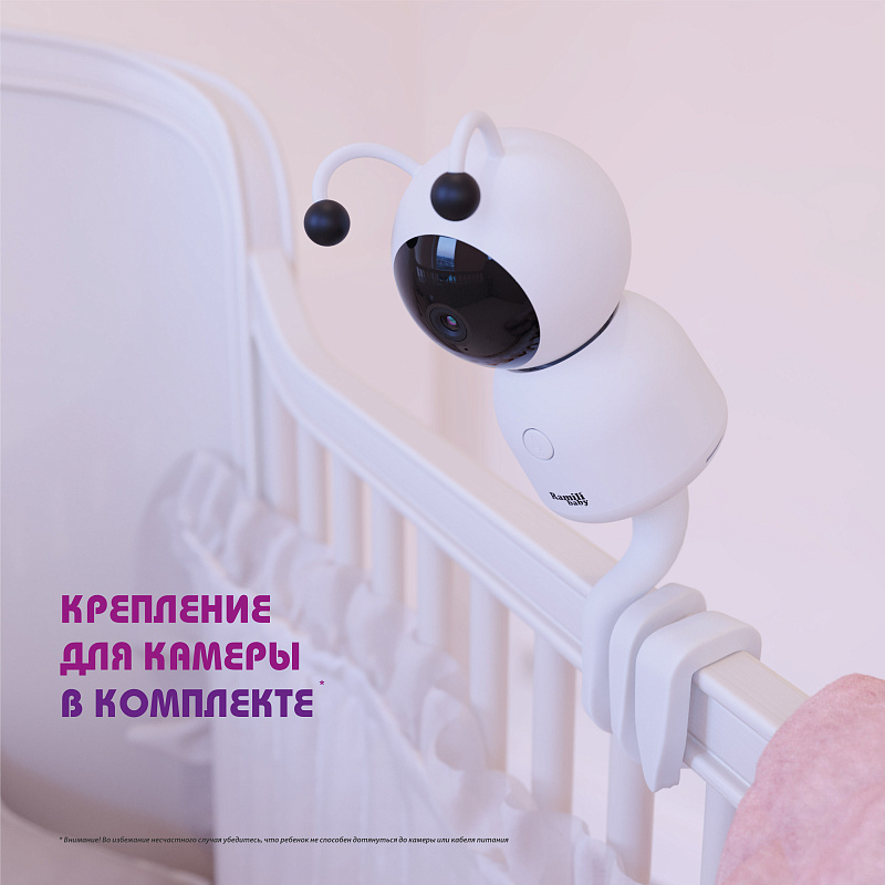 - Предусмотрена возможность крепление камер к бортику кроватки или к коляске (пожалуйста, убедитесь в безопасности, ребенок не должен дотянуться до камеры или кабеля адаптера питания, что может стать причиной несчастного случая, иначе откажитесь от крепления к кроватке или коляске).