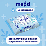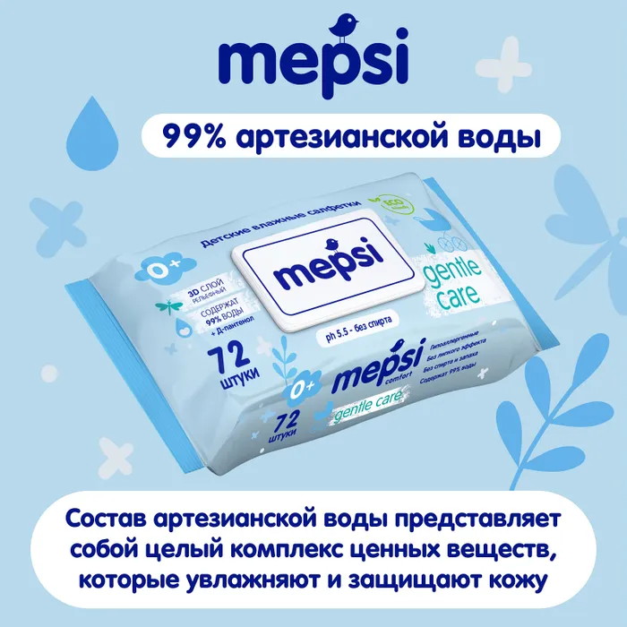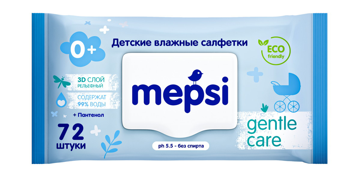 Влажные салфетки Mepsi Gentle care, детские, без спирта, 0 +, 99% воды + пантенол, 72 шт Влажные салфетки MEPSI специально разработаны для нежного ухода за малышами, которые уже начали активно познавать мир. Салфетки MEPSI незаменимый помощник для мамы в уходе и заботе о нежной коже малыша. Первые шаги и прогулка на свежем воздухе принесут больше удовольствия и радости, а кормление и простой гигиенический уход станут легче и удобнее. Салфетки также безопасны для новорожденных, нежно и бережно очищают, увлажняют и освежают кожу ребенка. Салфетки Mepsi изготовлены на основе натуральных материалов, имеют оптимальный размер, одной салфетки будет достаточно для использования.
