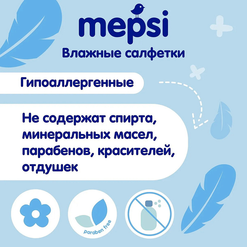 Влажные салфетки Mepsi Нежное очищение, гипоаллергенные, без запаха, без спирта, 72 шт Гипоаллергенные детские влажные салфеткиMepsiпрекрасно подойдут для ежедневного ухода за нежной кожей младенцев. Салфетки сделаны из мягкого сетчатого материала, не содержат спирта и не имеют запаха. Они бережно удалят загрязнения, обеспечивая уход и чистоту при смене подгузника. Благодаря практичной упаковке с пластиковым клапаном салфетки не будут пересыхать, а компактный размер позволит держать их всегда под рукой. Особенности: Не имеют запаха. Не содержат спирта. Легко и бережно удаляют загрязнения. Мягкая pH формула не сушит кожу. Подходят для чувствительной кожи.ф