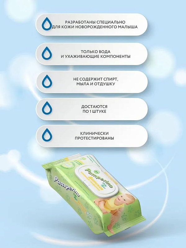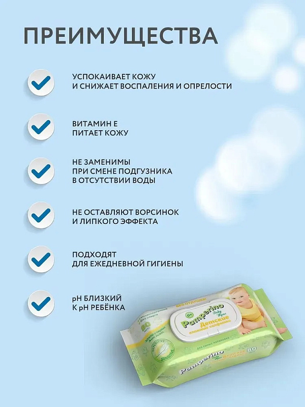 Влажные салфетки Pamperino №80 детские, без отдушки, гипоаллергенные, с пластиковым клапаномНет оценокХарактеристики