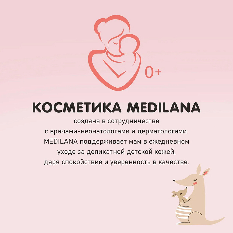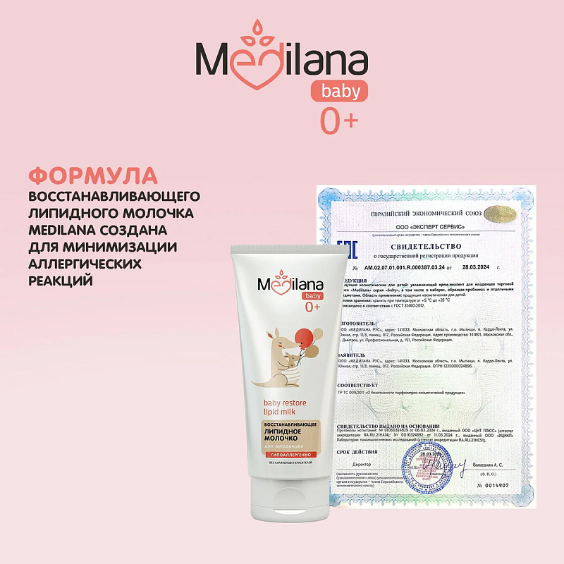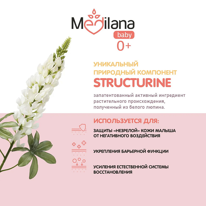 Восстанавливающее липидное молочко для младенцев MEDILANA baby подходит для ежедневного ухода за кожей. Восстанавливающее липидное молочко способствует укреплению барьерной функции кожи. Активные ингредиенты помогают восстановить гидролипидную мантию, предотвратить потерю влаги, стимулируют процессыестественной защиты. Молочко обладает легкой текстурой, быстро впитывается, уменьшает сухость и шелушение. Состав:Aqua, Glyceril Stearate, Cocos Nucifera Oil, Hydroxyethyl Urea, Macadamia Ternifolia Seed Oil, Olea Europaea Oil, Cetearyl Alcohol, Phenoxyethanol, Ceteareth-23, Ceteareth-6, Tocopheryl Acetate, Stearic Acid, Panthenol, Acrylates/C10-30 Alkyl Acrylate Crosspolymer, Rosmarinus Officinalis Extract, Hydrolyzed Lupine Protein (Sructurine®), Parfum, Ethylhexylglycerin, Squalane, Olea Europea Oil Unsaponifiables, Hydrogenated Olive Oil, Linoleic/Linolenic Triglyceride, Hydrogenated Olive Oil Unsaponifiables, Sodium Hydroxide, Retinyl Palmitate, Tocopherol, Retinyl Acetate, Dimethyl MEA, Lactic Acid, Sodium Benzoate. Способ применения:Перед нанесением вымойте руки. Легкими аккуратными движениями нанесите небольшое количество молочка на сухую кожу лица и тела малыша и, не растирая, оставьте до полного впитывания. Подходит для ежедневного ухода за нежной кожей новорожденных, поддерживает ее здоровый вид