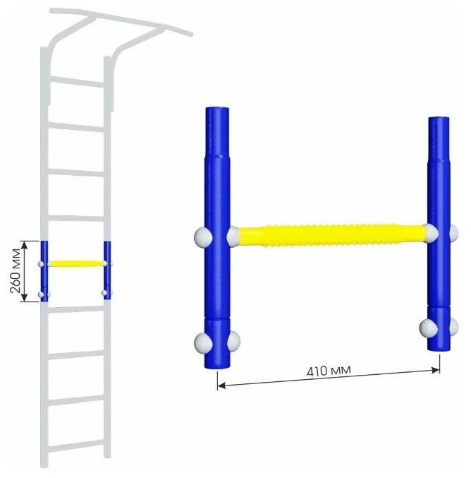Romana Вставка для увеличения высоты ДСКМ Dop8 410 мм позволяет увеличить высоту шведской стенки на 26 см. Подходит исключительно для домашних металлических детских спортивных комплексов Romana с массажными ступенями и шириной лестницы 45 см (410 мм по паспорту). Если высота потолков у Вас дома больше, чем базовая высота детского комплекса, достаточно установить в середину конструкции дополнительную вставку - и проблема будет решена.