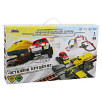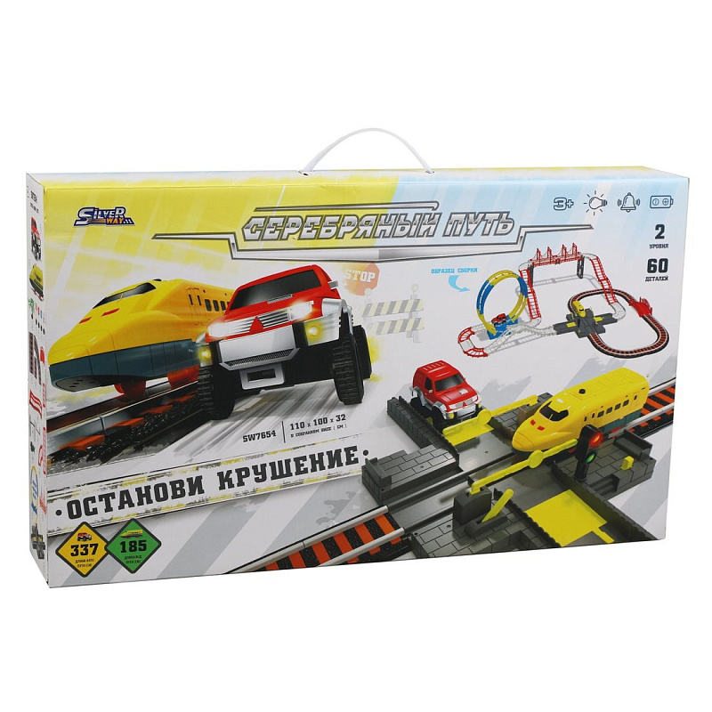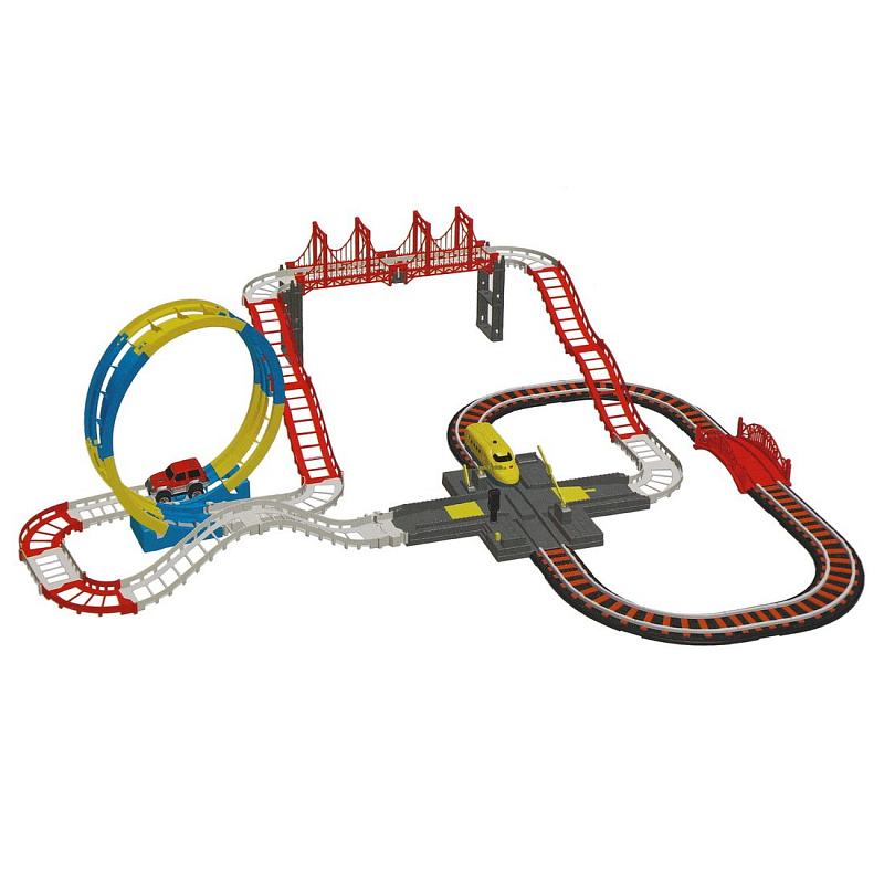 В наборе65 деталей, ж/д переезд (свет, звук), деревья, дорожные знаки, ж/д мост, 2 автомобильныхмоста, элемент "мёртвая петля", поезд, машинка