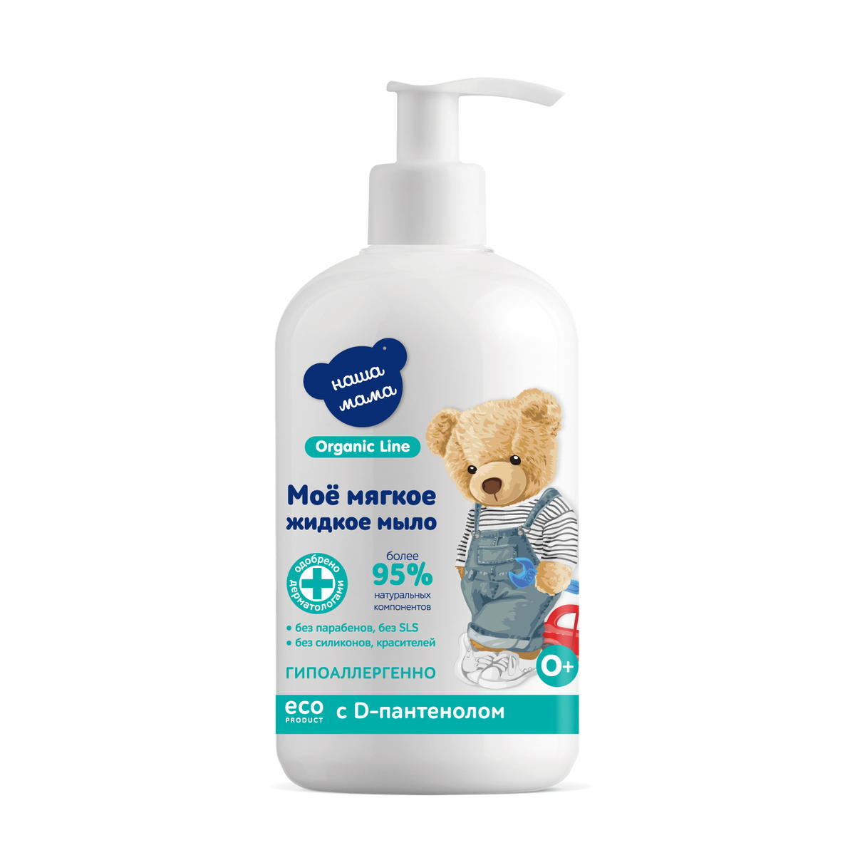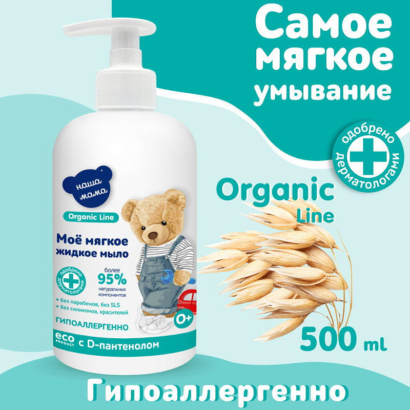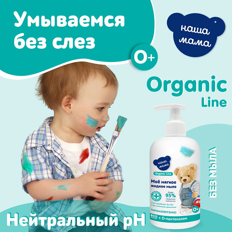 Специальная органическая эко-формула мягкого жидкого мыла для малышей с чувствительной кожей серии "Наша мама Organic Line", создана на основе натуральных мягких ингредиентов и обогащена Д-пантенолом и Бисабололом, обладает доказанным антимикробным эффектом и идеально подходит для ежедневных гигиенических процедур малышам с рождения 0+. Жидкое мыло для малышей с чувствительной кожей "Наша мама Organic Line" не содержит SLS, парабенов, силиконов, красителей и агрессивных антимикробных компонентов. Благодаря мягкой моющей натуральной основе, ионам серебра, Д-пантенолу, жидкое мыло не вызывает раздражения, бережно очищает кожу ребенка, обеспечивает длительную защиту от бактерий. Жидкое мыло имеет физиологический pH.