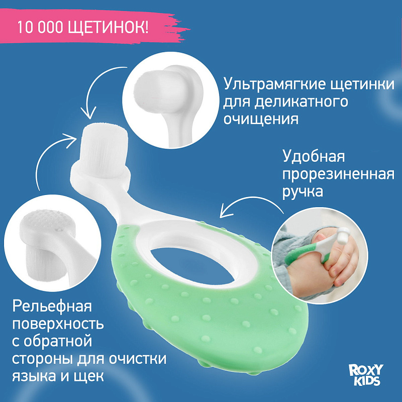 Зубные щетки SEAHORSE от ROXY-KIDS с ультрамягкой щетиной предназначены для комфортного и безопасного ухода за первыми зубками и полостью рта малыша. Зубная щетка оснащена небольшой головкой и мягкой щетиной, которая бережно удаляет налет с детских зубов, а также аккуратно массирует десны. Поверхность ручки имеет рельефные элементы, поэтому щетка не будет скользить в детской руке. Прорезиненную часть можно безопасно грызть и кусать, а заднюю верхнюю часть щетки можно использовать для очищения языка.