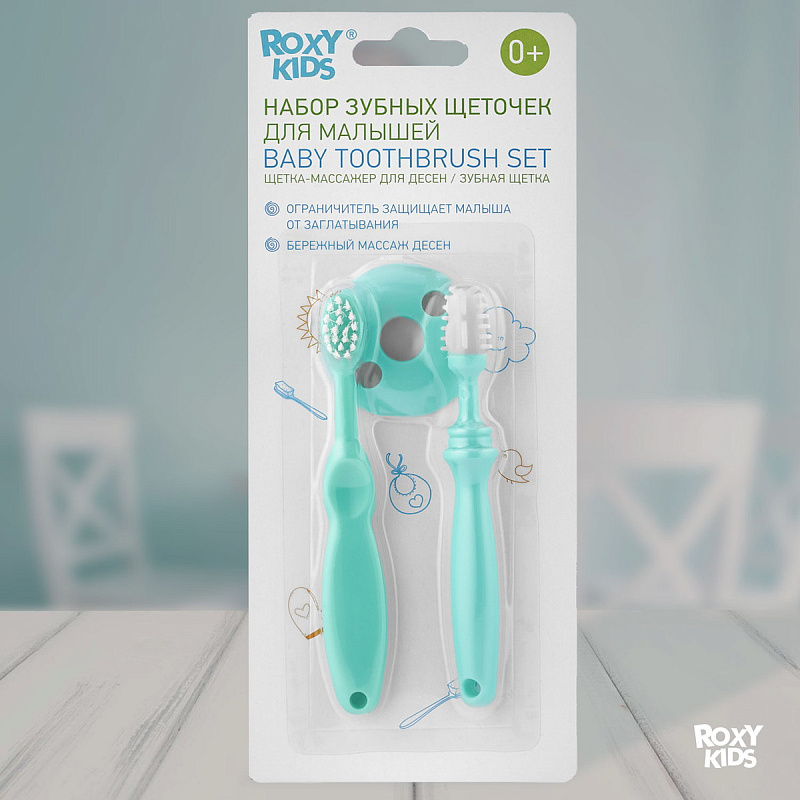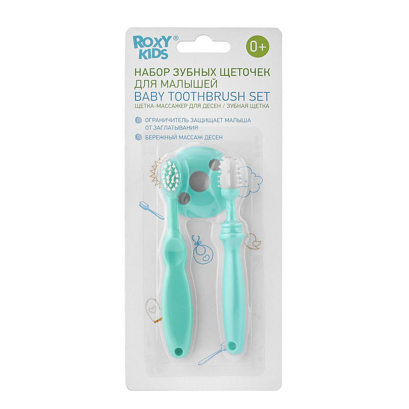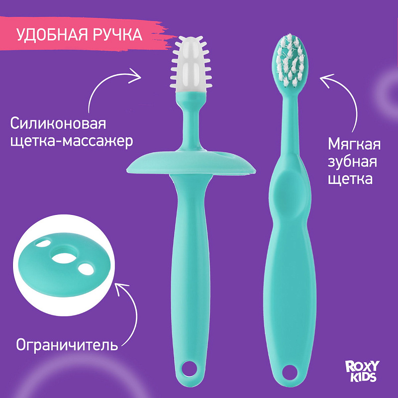 Набор из зубной щетки и массажера ROXY-KIDS сделает уход за нежными деснами и первыми зубками малыша удобным и эффективным. Выполненный из гипоаллергенных, качественных материалов, набор полностью безопасен для малыша. Зубная щетка оснащена небольшой головкой и мягкой щетиной, которая бережно удаляет налет с детских зубов, а также аккуратно массирует десны. Щетка снабжена эргономичным держателем, удобно ложащимся в руку. Щетка-массажер помогает снять дискомфортные ощущения в период прорезывания зубов, уменьшить зуд и боль в деснах. Чтобы ребенок случайно не заглотил щеточку, на ручку устанавливается круглый ограничитель. Минималистичный дизайн обеспечивает простоту ухода за щетками. Набор очень легкий и компактный, поэтому при необходимости его можно брать с собой в дорогу, чтобы в любой момент у вас под рукой были необходимые малышу гигиенические принадлежности. Набор соответствует всем стандартам безопасности.