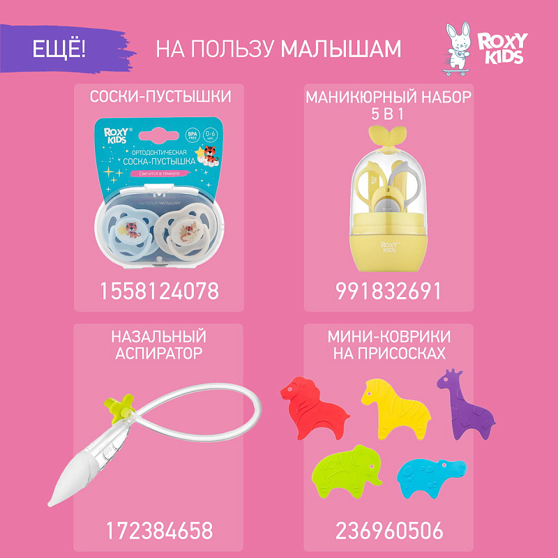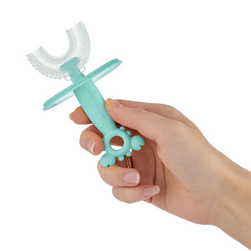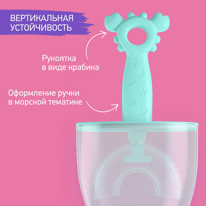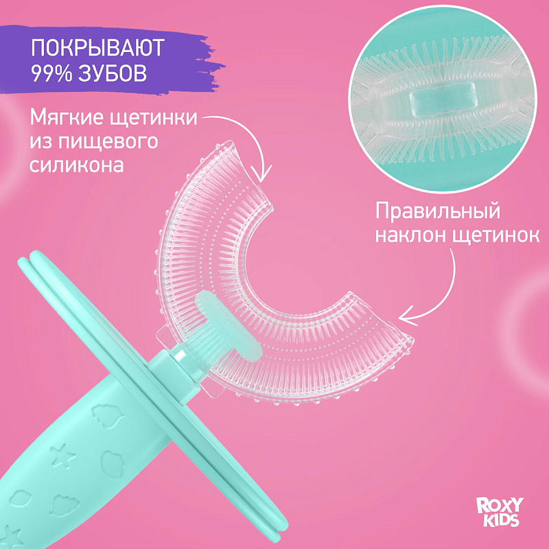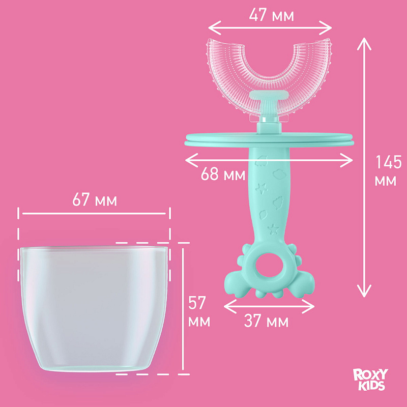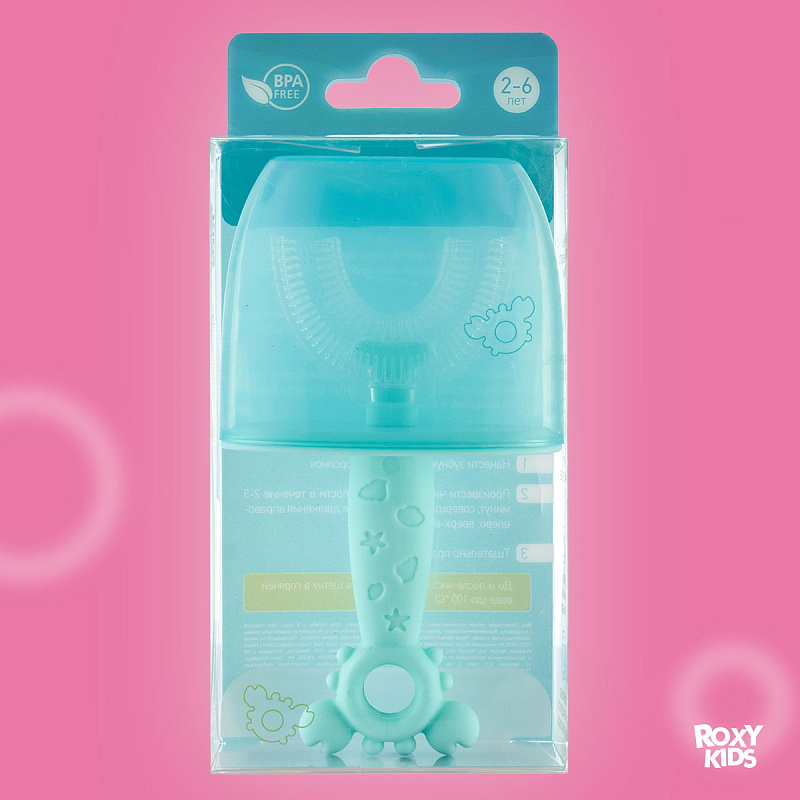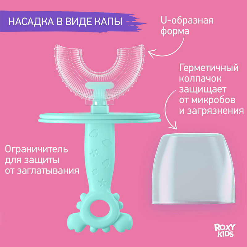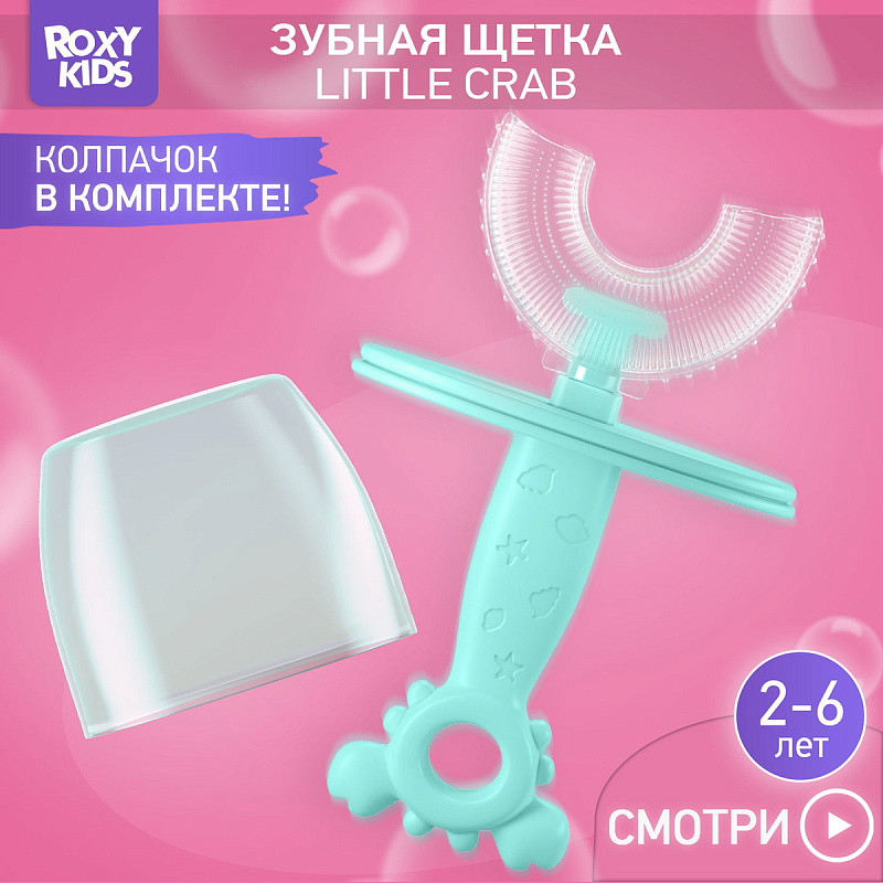 Силиконовая зубная щетка-массажер LITTLE CRAB от ROXY-KIDS превращает процесс обязательной ежедневной чистки зубов в увлекательную игру. U-образная щетка в форме капы покрывает 99% зубов, а мягкие силиконовые ворсинки бережно массируют десны, улучшают кровообращение и удаляют зубной налет. Зубную щетку можно использовать в качестве прорезывателя или для нанесения на десны лечебного успокаивающего геля при прорезывании зубов. Специальный ограничитель предотвращает заглатывание щетки. В комплект входит герметично закрывающийся колпачок для хранения, который защитит щетку от бактерий, микробов и загрязнения.